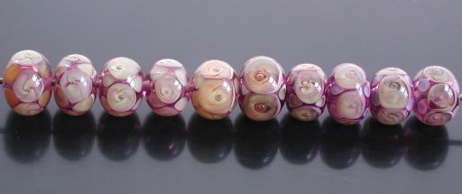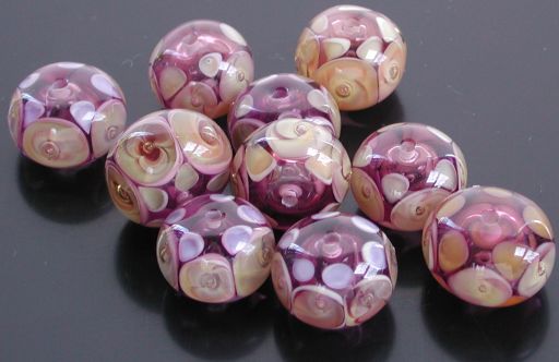 I'm much too lazy and impatient to emply this technique, so I just swot out a little hollow instead. On a good day (of which there have lately been very few) the walls are of relatively even thickness. For these beads I used a 046 pale transparent amethyst; this proved to be just about the only thing I did consistantly.