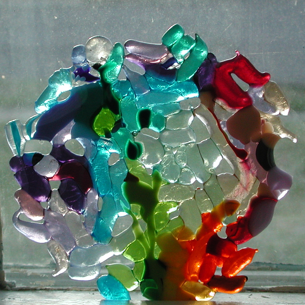 See, the thing about fusing glass is, fused glass goes to a quarter inch. I didn't lay down enough, so all these holes opened up. Well, I have lots to learn with fusing, obviously. But in the meantime I think this, um, experiment (i.e. wholesale failure) makes a nice suncatcher.