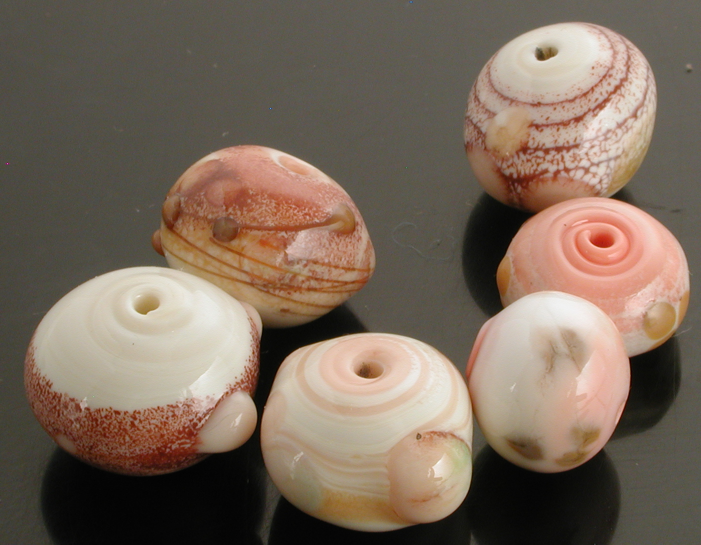 series of scrap beads made with shattered CiM ginger, ‘dopped’ onto light ivory, rolled in brown, cream and similar TEs; hollow, ranging in size from 10x15mm to 15x17mm. 2007.