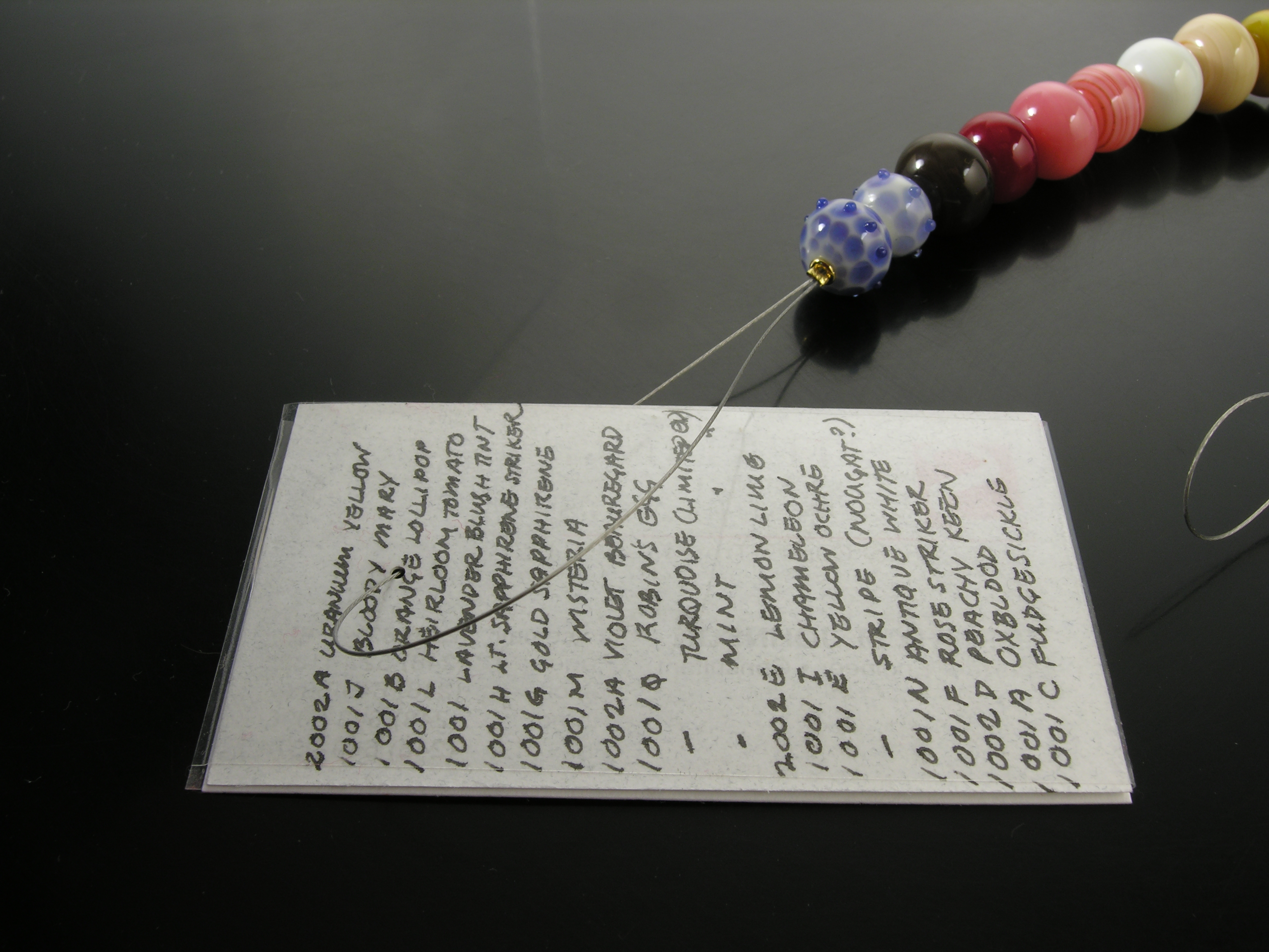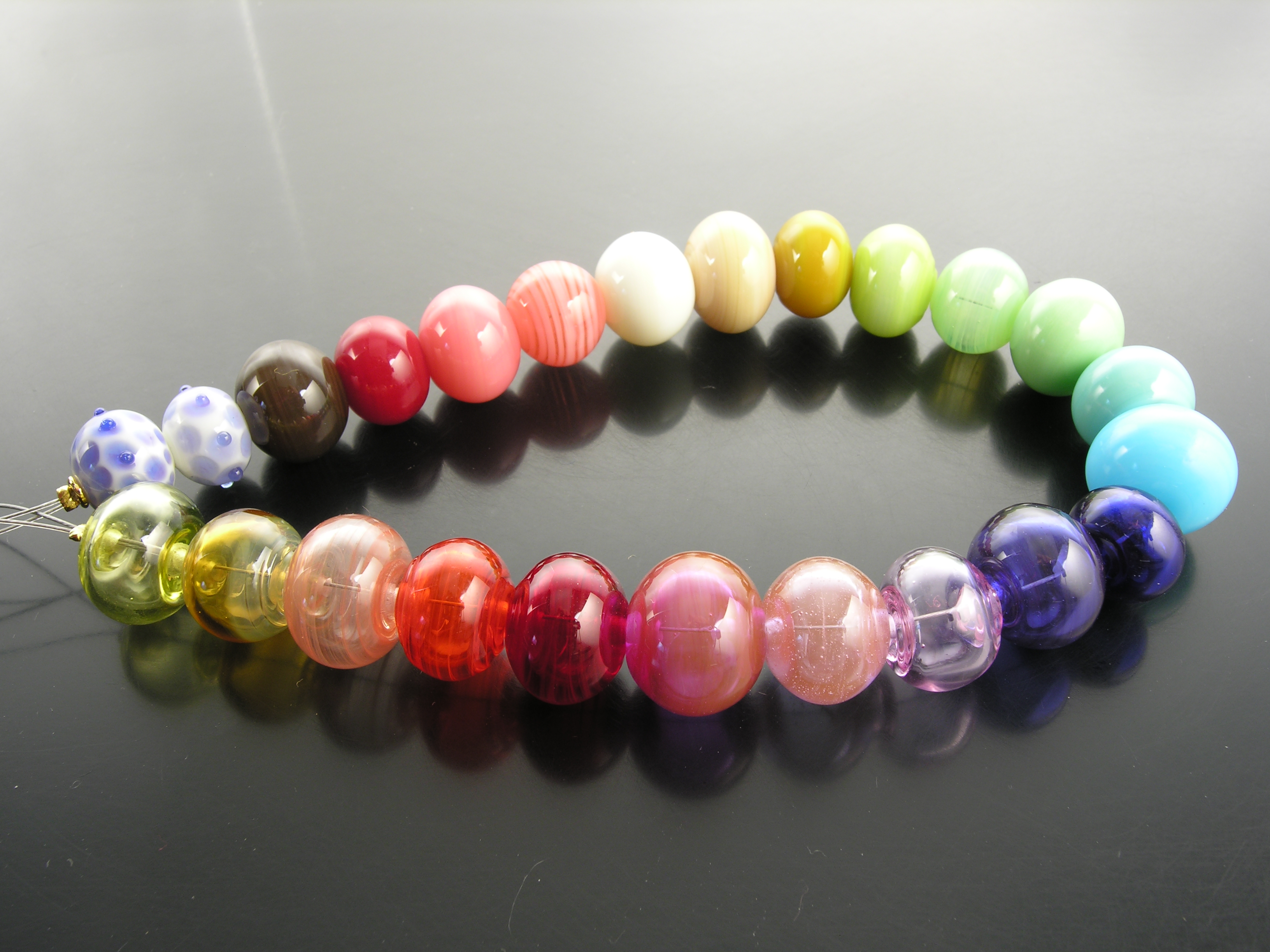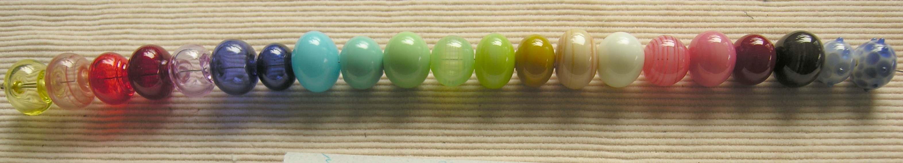 Limited edition colors, most from 2007. I think. (Hollow lampwork samples, generally around 13mm hole to hole.) I think I started these in Dec 07 (easy no-think project); completed Jan08.