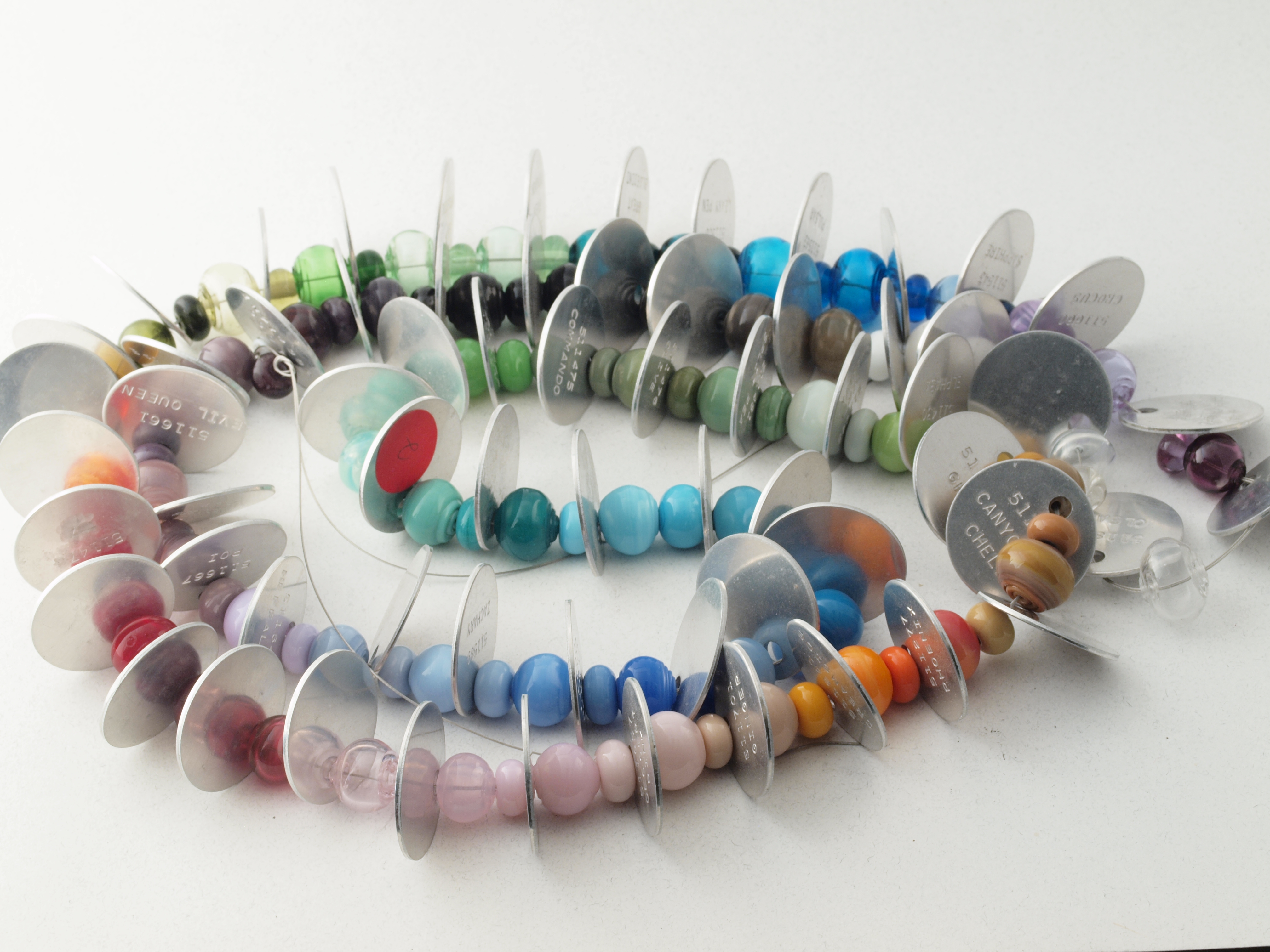 [10]The guild as a whole divided up the colours and everyone made enough solids for each person to have a sample strand. In addition I made 5 hollow beads of all of the colours. I kept one set, one was donated to Cindi B, who did the work of organizing the sample strand project, Kathy Seamands, who donated the glass, got one, Don Miller, who for many years hosted our guild got one and the last one was donated to the ISGB to auction off.