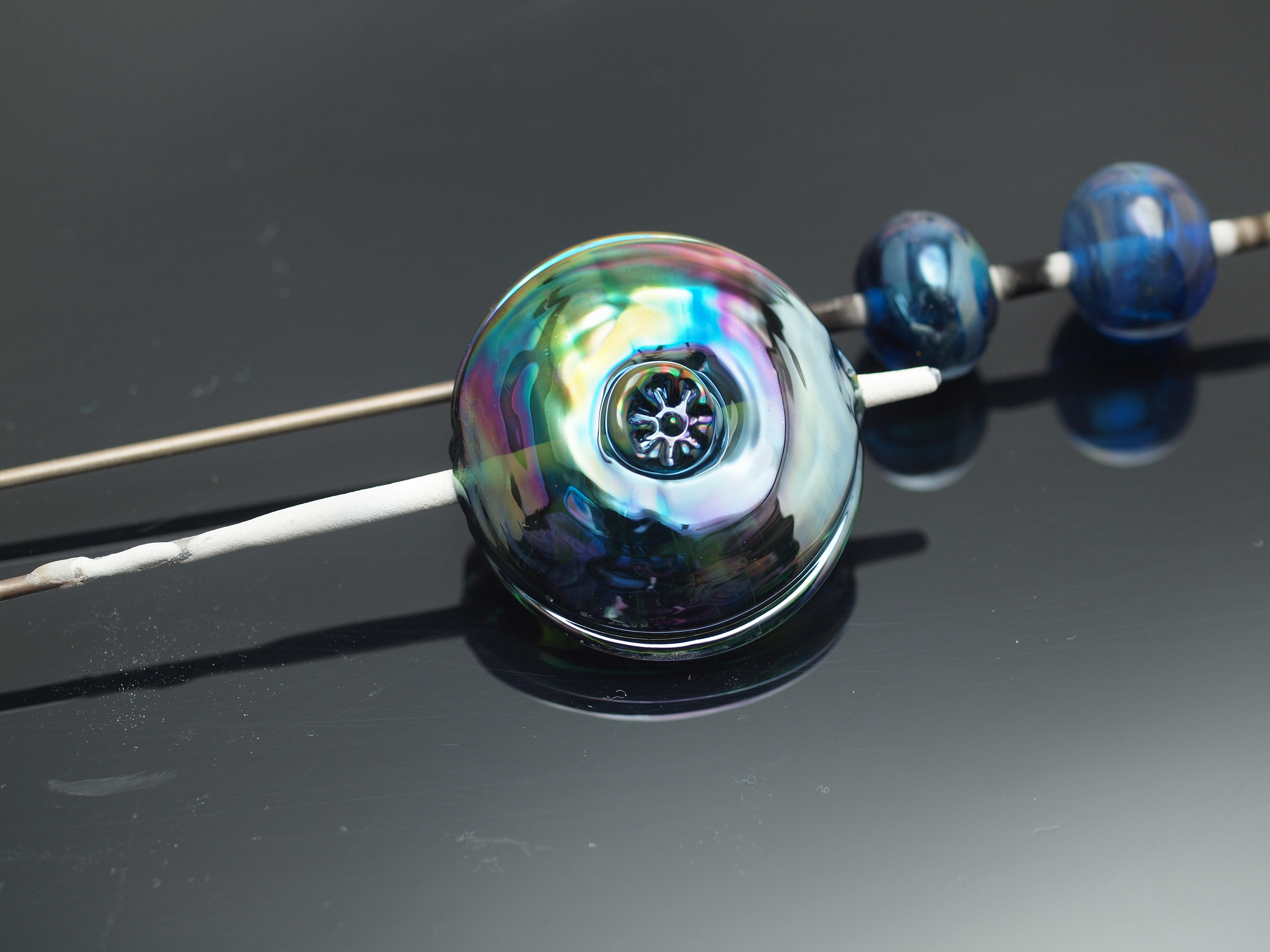 The bead was nevertheless a plain, dark blue transparent until I completely turned off the oxygen in the outer ring and briefly bathed the bead along the left edge with the resulting reducing flame. Afraid that I would lose the reaction if I rewarmed[2] , I just stuck it in the kiln and hoped. I lucked out.