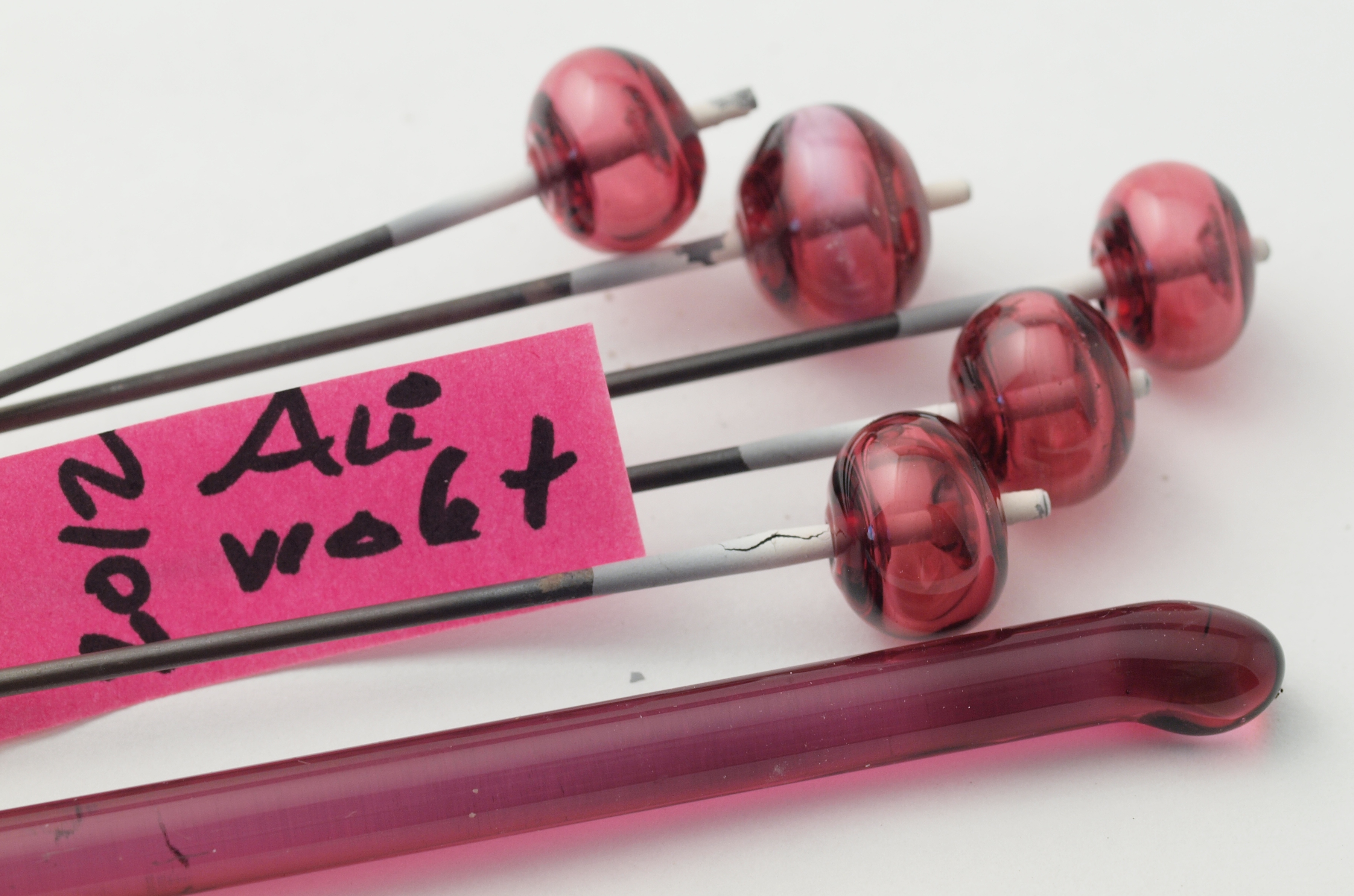 Gold violet–boils and scums something awful in oxygenating flame; striking. Use neutral to reducing flame. Doesn't develop full color till cool; compare to check glass tourmaline.
