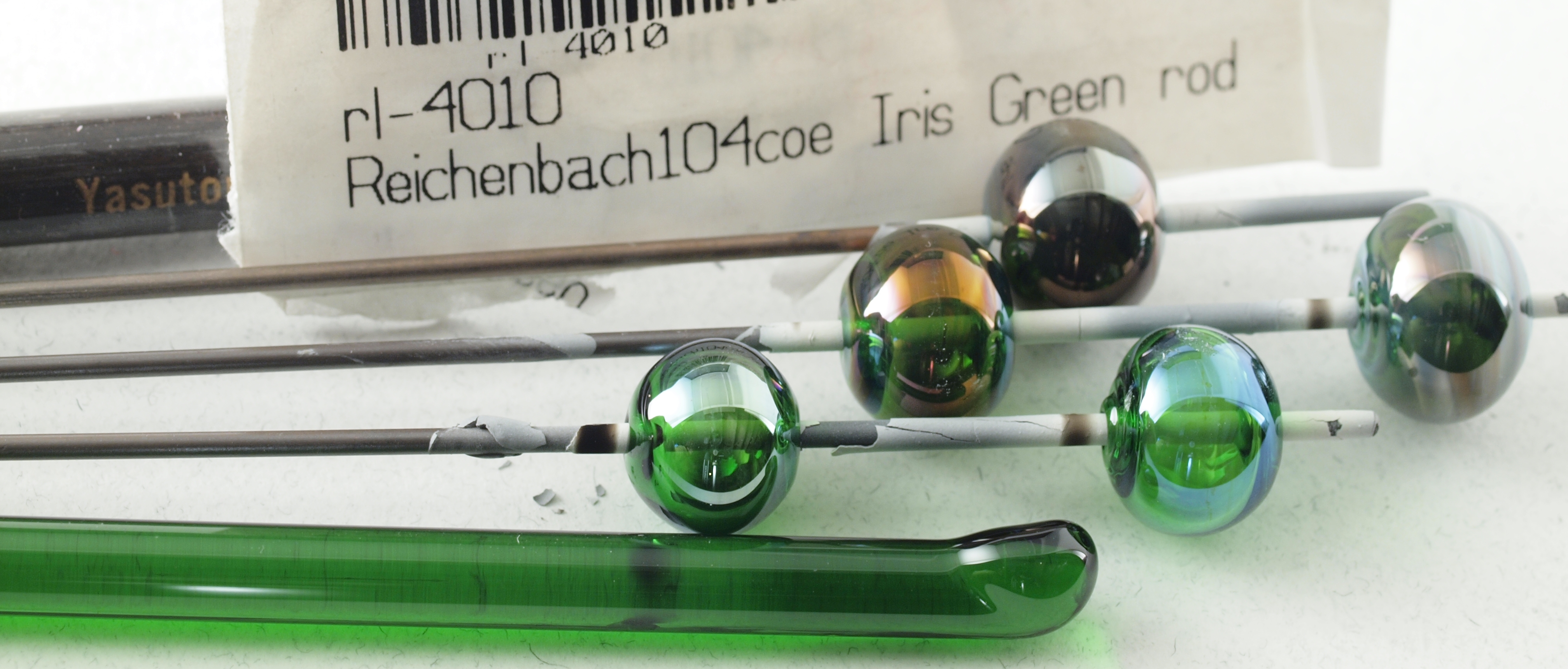 iris green—popular as a frit with lampworkers for years. Seems to strike (i.e. reduce) better if bead is made with a mildly oxygenating flame.