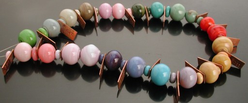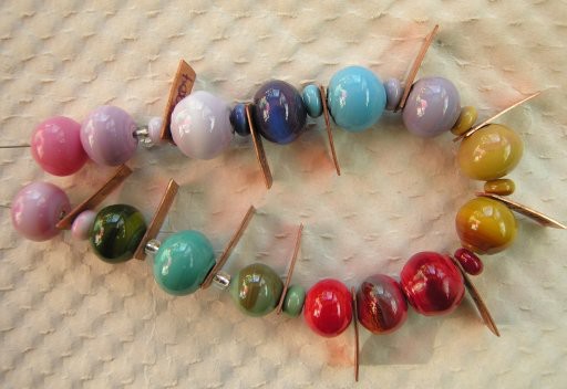 This is not the greatest of pictures, having been shot on my studio floor, with a great many distracting window-reflections on the beads. But it at least gives an idea of how this stuff looks worked in the flame.