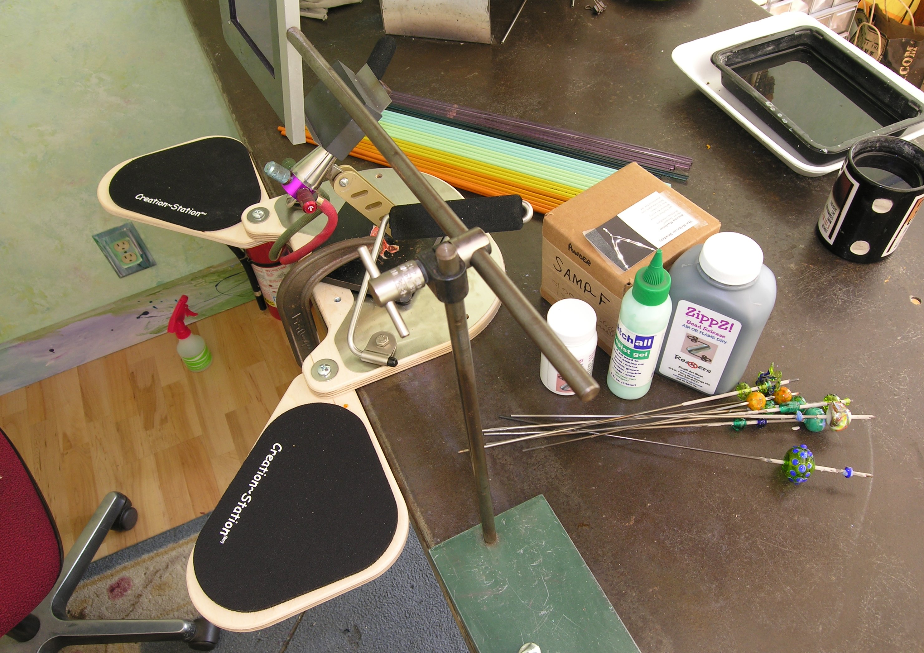 from back to front (more or less) we have: Bullseye glass, in experimental or new colors I haven't got; creation station; F lot series 7000/8000 Thompson enamels to test; Zippy-Z bead release; etchall resist; and zapp-z hole cleaner/polishing compound and sample beads made while at Gathering. Not shown are the 3/8” Emiko-style big-hole mandrels from Arrow Springs.