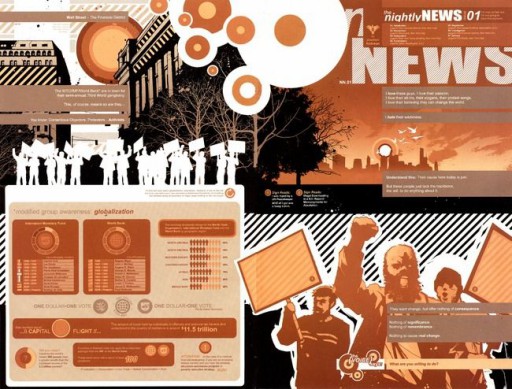 This spread is a beautiful and representative sample of Hickman's 2007 6 issue compilation by Image Comics, Nightly News.