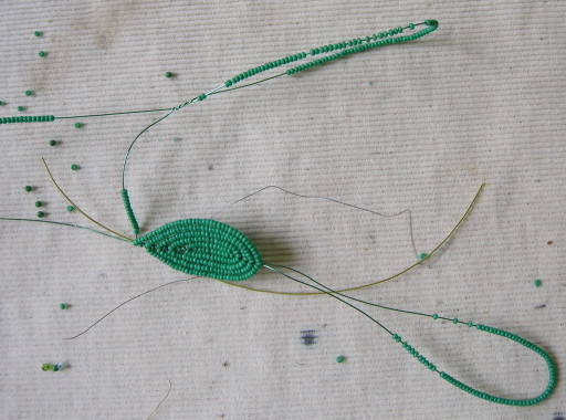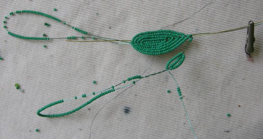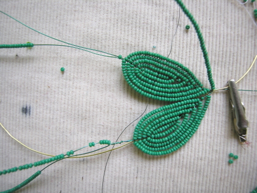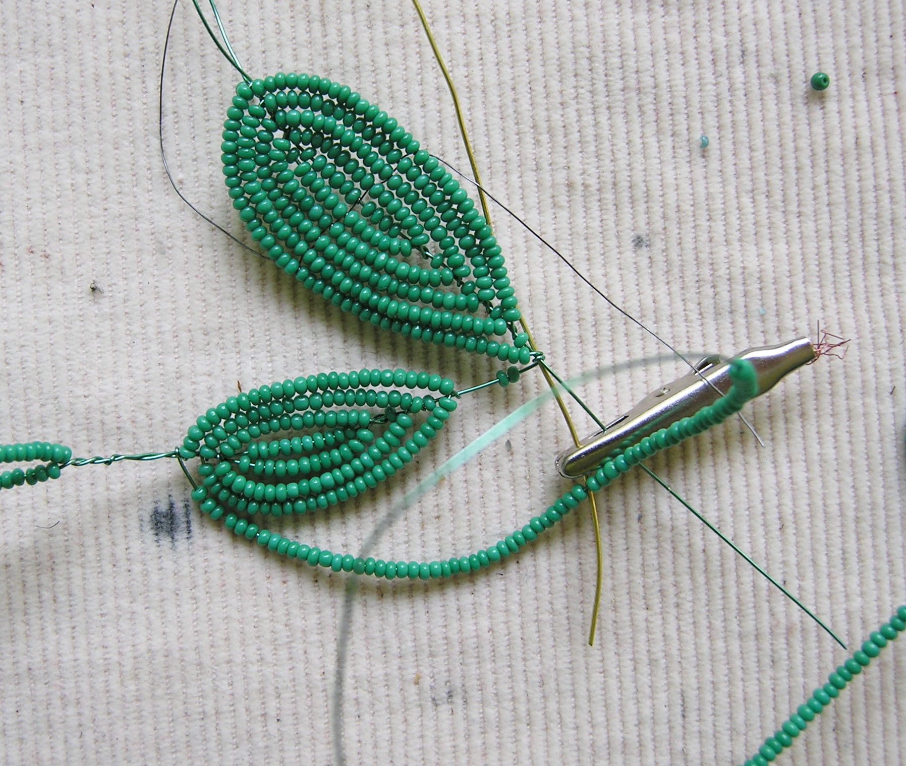 Twist from loop all the way to base of 10 count. Start making second leaf(let), round bottom, very pointed top with one bead between each wrap.