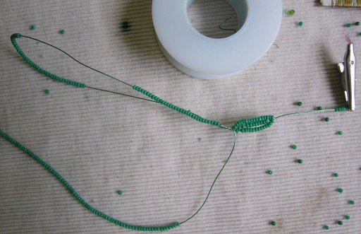 Wrap the spool wire around a 22ga brass stiffening wire or similar; then set up for the second half. For this part of the leaf, you must pay a little more attention to the lengths of the spool wire. Count off 14 beads—10 for the beginning of the frame, and four to act as spacers to make this half of the leaf pointed. Position the spool wire along middle of first (half)leaf; then capture several inches more of beads[2] , and start twisting at the same point as for the other “midrib”[3] in the loop