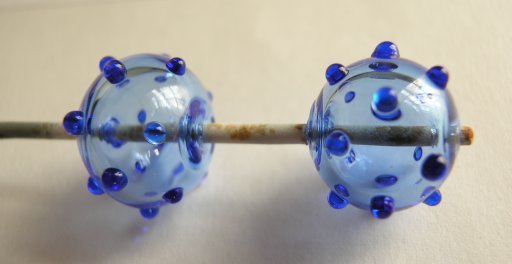 However, for glasses, e.g. dark aquamarine, that are prone to forming a scum when marvered on graphite, this approach eliminates that unsightly line of tiny bubbles along the equator. (For all I know marvering on brass may achieve the same effect with considerably less effort; I know some colors react differently—perhaps I ought to mount a strip of brass on my torch...)