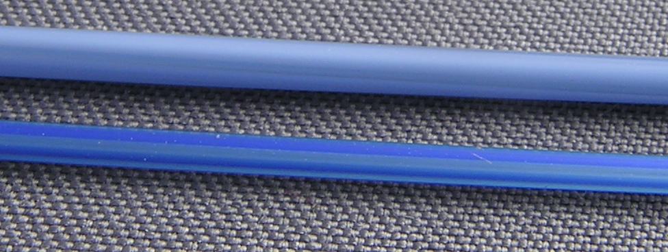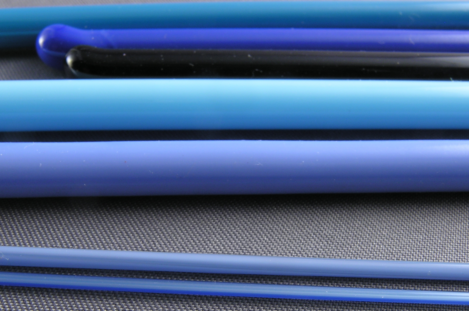 Two experimental blue canes, and the rods used to make them: from front to back: periwinkle, light sky blue, ink blue (transparent), light cobalt blue, darkest (vetrofond) turquoise. Not shown: medium transparent aqua. The first three colors were used in the round cane, in back; all but the periwinkle were used in the ribbon cane, front.