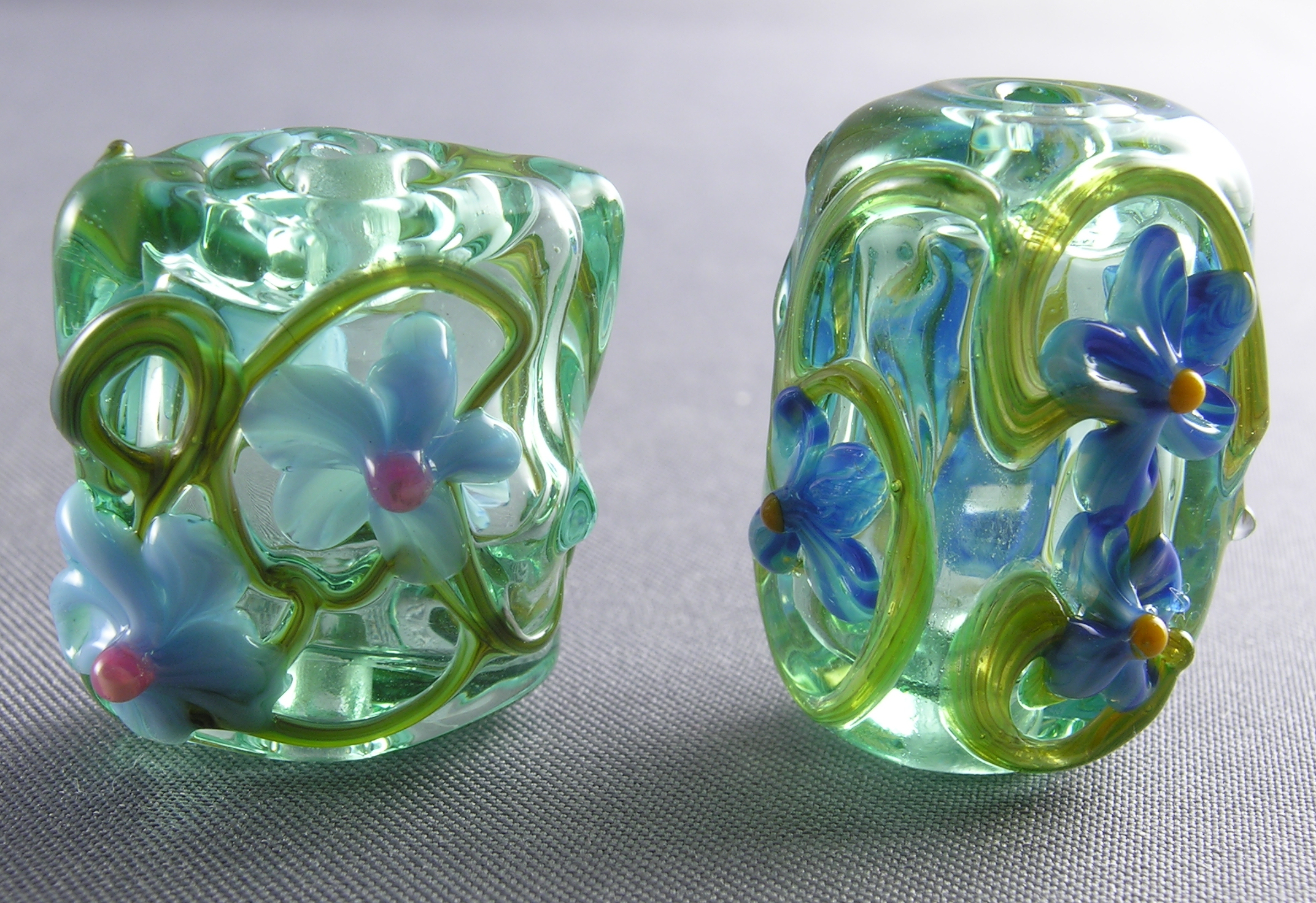 Two florals, 18x21x12mm and 15x17x23mm. Check glass hollow pressed bases, the rectangle with mashers only. See text for exact recipes of effetre floral canes.