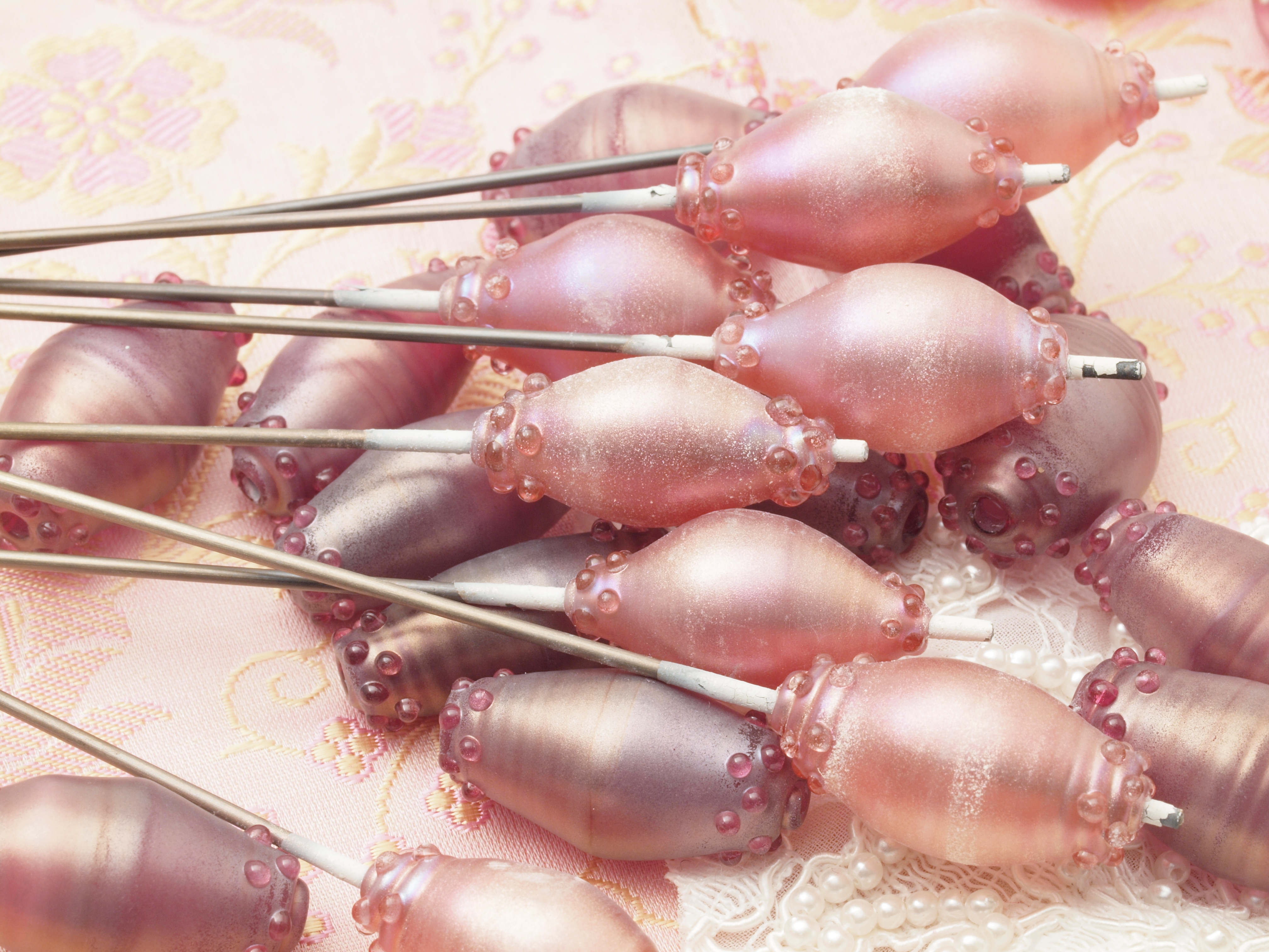 - Bright pink: unknown. Possibly dark opq pink cased with gold ruby & striped with white