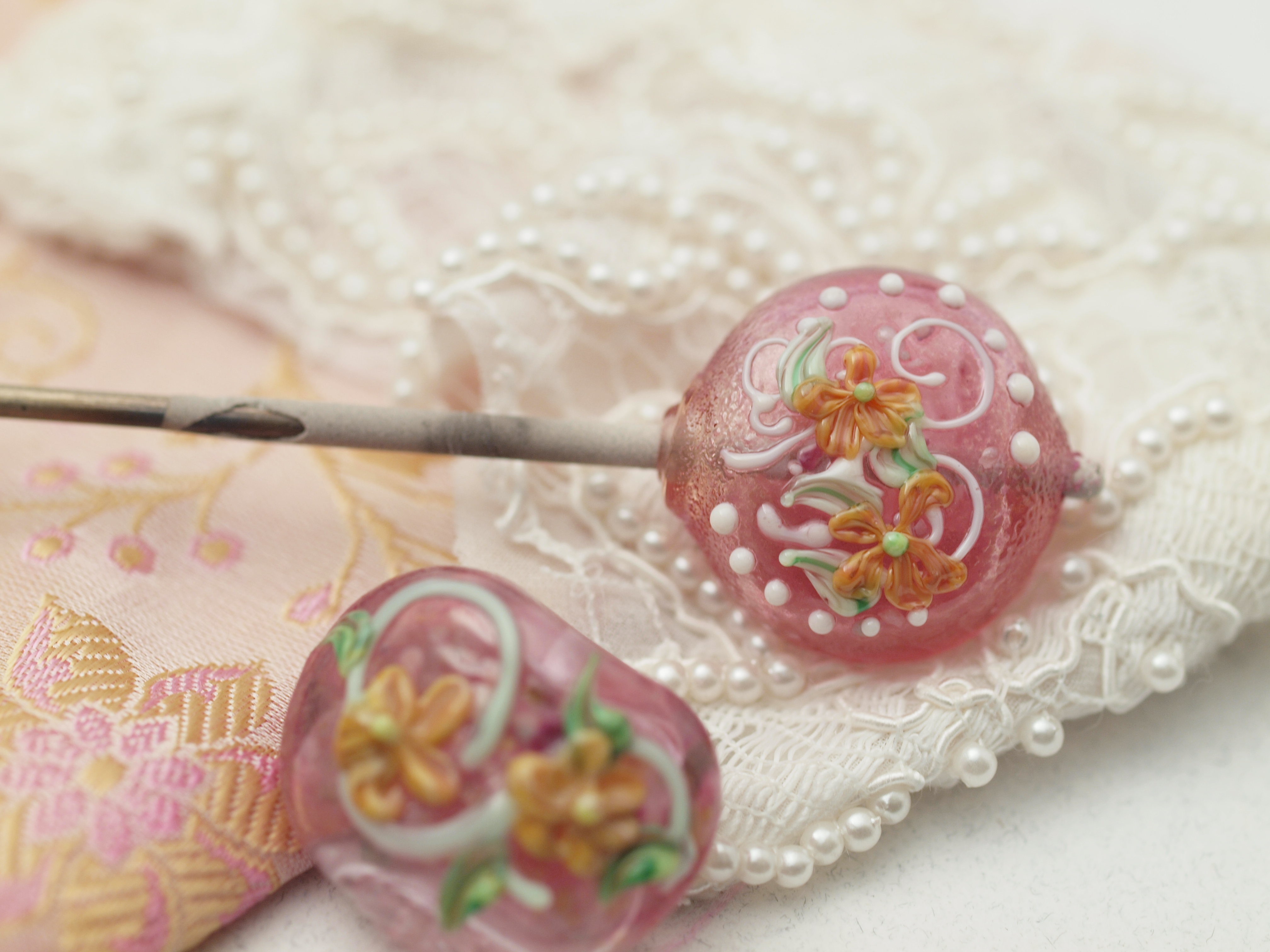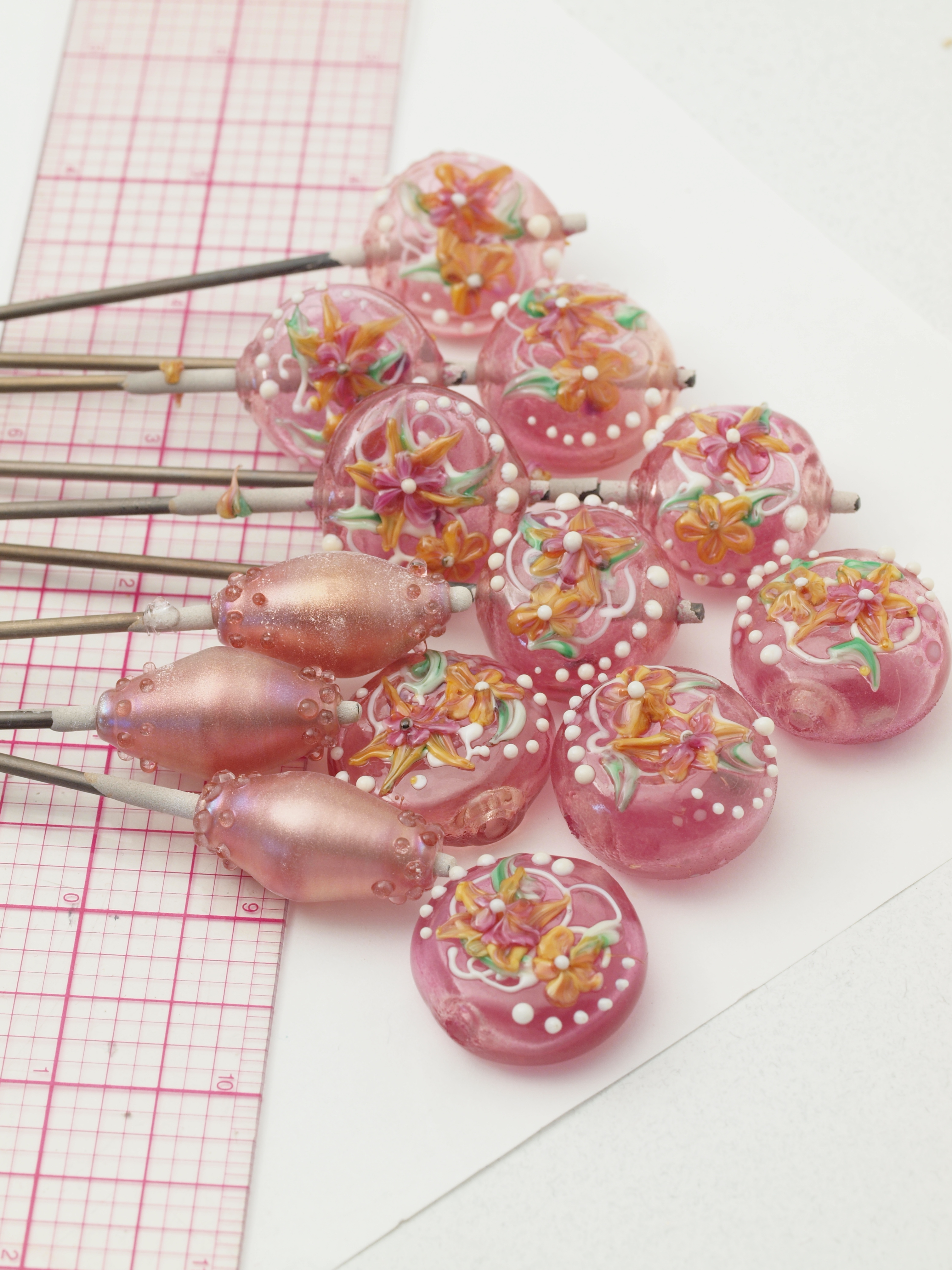 Using v small flame, apply scrolling (<1mm stringer). Add three leaves, covering particularly ugly junctions of scrolling. Pull out points (using stringer). Add large 5 pointed petal on left side using yellow cane; pull out points and center. Add smaller 5 rounded petal flower on right side; pull out center. Add smaller 5 rounded petal on top of 5 pointed, spacing pink petals between yellow pointed petals. Use tweezers as needed to move center, shape etc.
