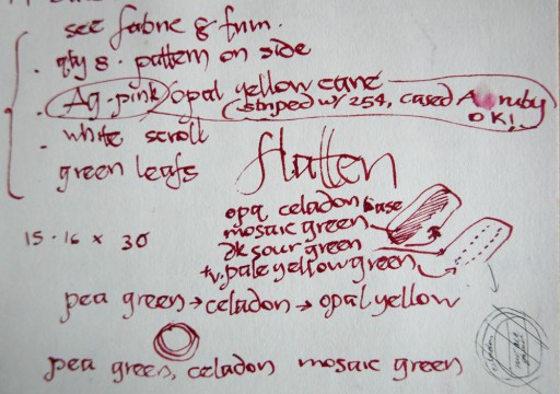- leaf: opaque ‘celadon’ (probably an opacified yellow-green); mosaic green; a very dark yellow green ‘sour’; pale yellow green (e.g. 071, or old 031 coke bottle) —see studio note book for cane layout