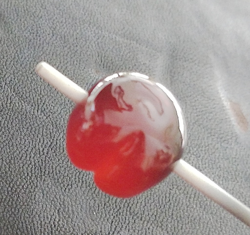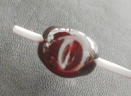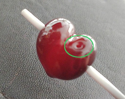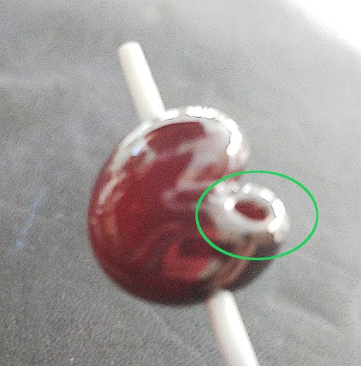 Using a knife or similar, on one edge of your disk, mark the center. Check. If it's not right, melt the bead (somewhat) smooth & try again. Note: in this view the bead disk is tilted so you're looking down on the top of the “heart”.