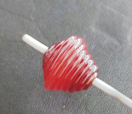 Even it out once it's fully heated and smooth. (The ridges are cool looking, but a source of cold seals, so I melt them smooth. Not all people do, but that's outside the scope of this tut.) Gently mash your bead into a flattened disk at least 3x the thickness of your mandrel—you absolutely don't want the glass to touch it!
