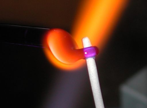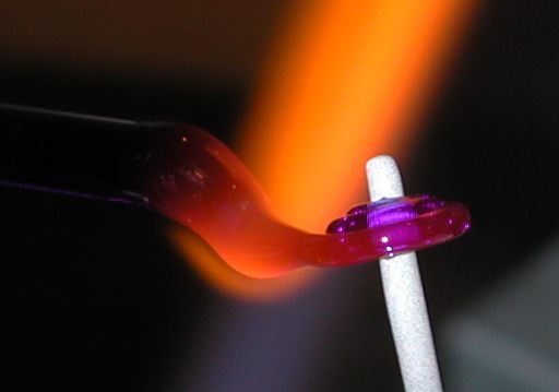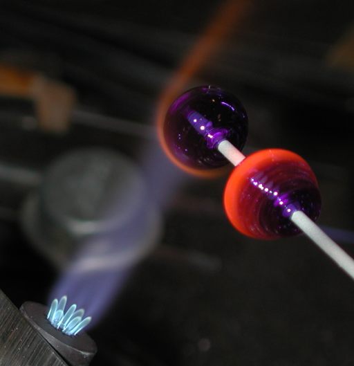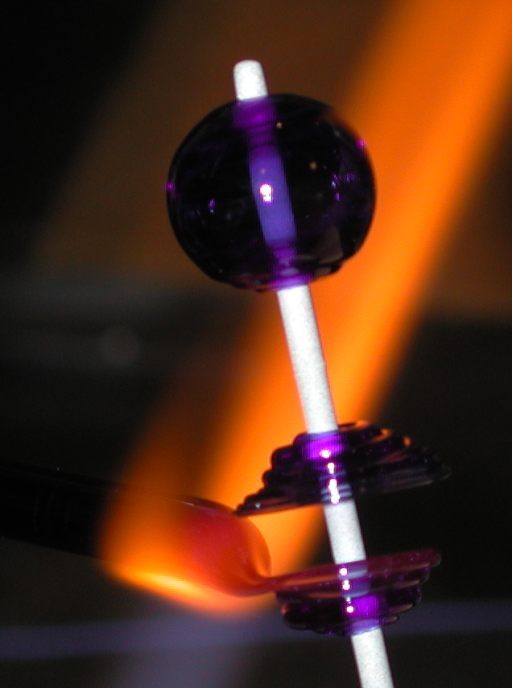 Nearly done. Earlier I mentioned that transparent cobalt blue is a good color for beginners. This is because the glass turns orange when hot, so it's relatively easy to gauge the temperature by color; it's also fairly easy to see pinholes and the like in the dark glass; and finally, because it's transparent it's easy to judge how much your bead puffed (or collapsed) when you're done. But, really the best glass is the one that for whatever reason (it's cheap! I don't care how much I waste practicing this stupid technique, or it's beautiful! I don't care how awful the beads are, the color's so pretty...) encourages you to practice.