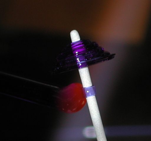 There were a bunch of fuzzy photos, so you're mercifully spared much the lather, rinse and repeat. Beginners may want to stop here. For the more adventurous, hey, you've got the slow step—getting the rod molten—done, so you may as well take advantage and put another bead on, right? However, after you've made the first half of your second bead, spend a few seconds twirling the first in the heat—usually one complete rotation will do the trick. Then warm up your first half of your second bead—it's a little fragile, till those coils get melted in. If in doubt, warm the first bead and then the first half the second bead in an alternating pattern a couple of times, to make them good and happy before starting on the second half of bead no. 2, as shown here.