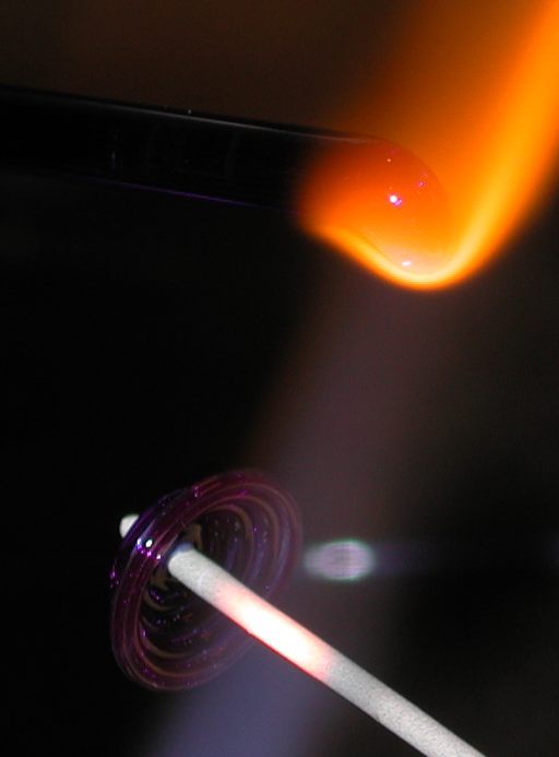 Note that the bead and mandrel are positioned beside the flame; it is the rod, providing the softened glass, that stays in the fire. Though nearly vertical in the photograph, in practice the rod is a little more angled from the my viewpoint.