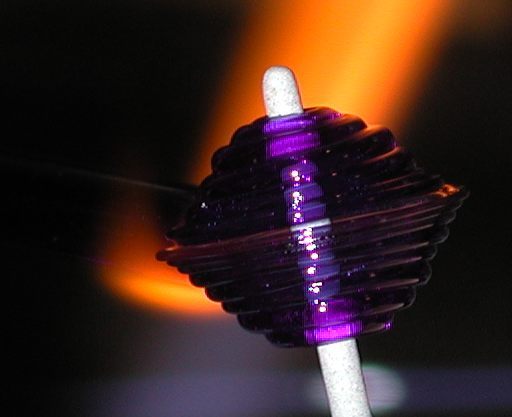 As with so many other things in life, less is more; or, put another way, you only use as much as you need to get the job done. Translated into glass terms, this means just as a big a flame, and just as forceful (and lengthy!) touch of the marver as is needed and no more. I might go back and forth between the marver and flame, gently sealing up holes and flattening the somewhat conical halves more to a sphere, several times—but all in the space of 15-20 seconds. This is one of the advantages of hollow beads—they're much faster to work. If you've been hearing ominous cracking sounds, though, execute this whole-bead warm slowly, to give cracks and cold-sealed coils a chance to warm and (amazingly enough) heal up. For thicker beads, you can rub the (handheld) marver back and forth in a sort of zig-zagging stitching motion to push the lips of your bead halves together. Once you are certain you've closed all the holes, heat the entire bead to puff it; you can hold it up to eye level to check that it's on-center, holding any high spots at the top of the mandrel so they sag (we all hope) into roundness. Often, I can just use gravity and a little patience to get a bead nicely shaped—no marver required. (This is the shot that didn't make it into the camera.) I personally prefer not to melt out the coils completely around the holes, because I like they way they look.