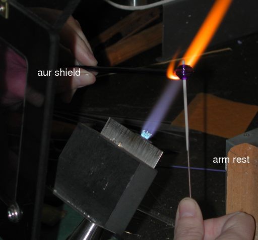 Many precision beadmakers like working really tight, which, obviously, I don't. I use a shield instead of glasses; not shown is the left-hand arm rest, which is hinged and follows my arm movements. The right is wedged with a piece of wood, which I move to change the angle.