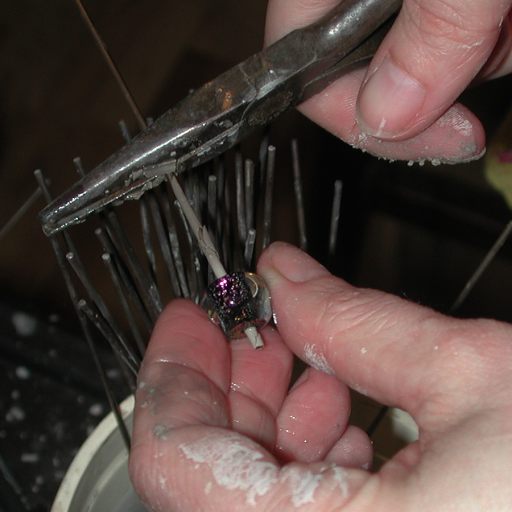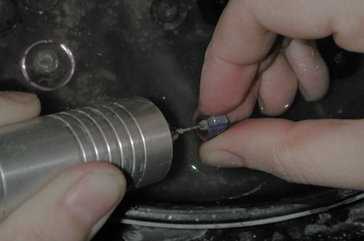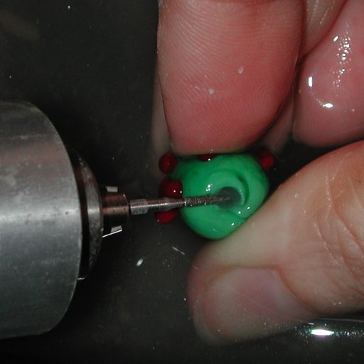 Now comes the fun part, dressing the hole. Cleaning the release can be done with a diamond coated reamer, but I haven't had much luck using hand tools to dress holes—not saying it can't be done, only that I'm too lazy to do it. Note that the tool perpendicular, rather than parallel, to the hole. Using only as much force as is needed, and working in small increments is a given with lampworking, and so too here. It's almost as if you're gently rubbing the tool across all those projections, just taking off a tiny bit at a time—try to do it all at once, and you'll just gouge the glass, the way roads get dips from washboard bumps. Circle round and round, taking a bit more off each time.