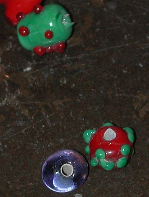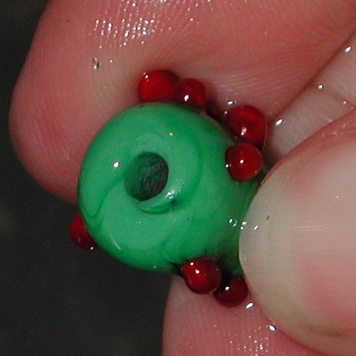 Hollow beads—transparent ones, anyway—look really, really bead with a line of bead release going through the middle, so I developed techniques for cleaning beads very early on. Holes full of release, or badly shaped holes, or even just dust on one's beads may not, in fact, look too awful on the typical bead; but photograph that sucker and blammo! even the smallest flaw suddenly looks huge (scroll down to that closeup). I happen to be the unofficial photographer for my local chapter, and it's my job to make everyone's beads look good. I can do a better job if they're properly prepared. And I have to say, I did not do a good job getting this point across for the 2004 postcard. So looking ahead to 2005...
