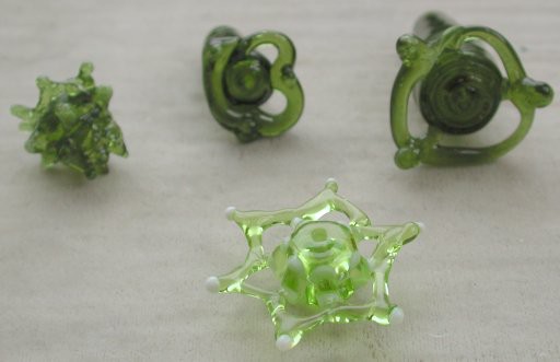 Back row shows 3 beads made with the PIG equivalent (more or less) of grass green. I just wanted to use the stuff up & figured it was close enough, and besides I wasn't doing color anyway, just form...(my rationalizations for using cheap glass are endless:) Front row: Effetre star, grass green 022 & white 204