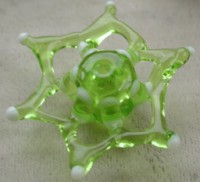 This bead was inspired by Jennifer Geldard's star beads, except I used two disks instead of one, and ran little bars to attach them; then I started building out the points, using more a drawn-stringer technique rather than the dot-build approach she favors. It was a fun bead to make. 12x38mm (point to point)