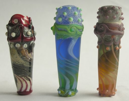 The first vessel, on the left, uses (pea-green) opaque stringer, bad choices in background glass and is just plain ugly.