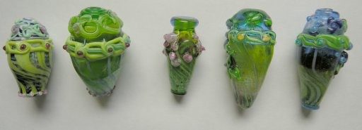 The red bead on the left was my effort to use copper as well as silver leaf, and it's basically a failure from a coloristic point of view—however, the style is more or less correct (this bead had a lot done to it, and was considerably better looking earlier on), and it stands up on its own: it was the reason I decided to go back to what I felt were original colors, concluding that I was so bad I couldn't even generate an original palette on my own. (Mixing copper and silver leaf to get this dark, antique surface was something we did in Stevi Belle's class.) Regardless of how they started all of these beads are solid.