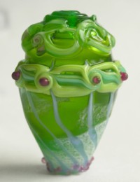 Geldard updates her website regularly, and a particularly beautiful blue and green striped vessel persuaded me to try again: this time, by trying to copy her style, even the color combinations, as closely as possible, though I should note, Geldard generally uses less saturated versions of the blue and green than I chose here. (I was helped by the class notes I had made, which specified stringer color combos I thought likely for this piece.) I was especially pleased with the flecking of the transparent cobalt frit on top of the white thompson enamel on the head of the bead.