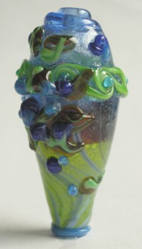 It is with the 4th and 5th beads that I finally felt I had begun to find a style that incorporated elements of what I really liked about Geldard's beads, but were beginning to differentiate themselves from her patterns. One of the difficulties of dragging stripes on hollow vessels is their tendancy to pop holes in thin spots; and this is what happened in bead #4. I was annoyed, but patched it and continued on. But the patch showed, and it was ugly. So I extended the floral decorations down into the body of the bead, covering the patch and incidentally crossing the trailing, which had served as a barrier. This was new. But not until several days later did I come up with a metaphor that justified this decision: ‘see,’ I told myself, ‘it looks like roses, spilling over a picket fence’. (There is a tendancy, when recounting the history of the creative process to tell these little verbal stories as if they came first, rather than after, as an explanation of what is often a totally non-verbal process.)