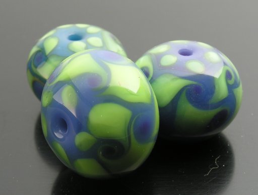 Like most of the beads I make, these are a hollow variation. I start out making a hollow bead, with thicker walls if possible. These are about 13mm hole to hole. The next step is put five rows of graduated dots on it, spacing the dots about 1.5 dot-diameter distance edge to edge (2.5 dot diameter center to center). This applies to the center, or beginning row only. All subsequent dots should be staggered, of course. For the largest bead, this works out to about 2–3mm diameter dot, 6 around. The smaller ones have five dots around. Melt most of the way in. Part of my problem in the past was trying to get the dots completely melted in, which inevitably ruined the holes.
