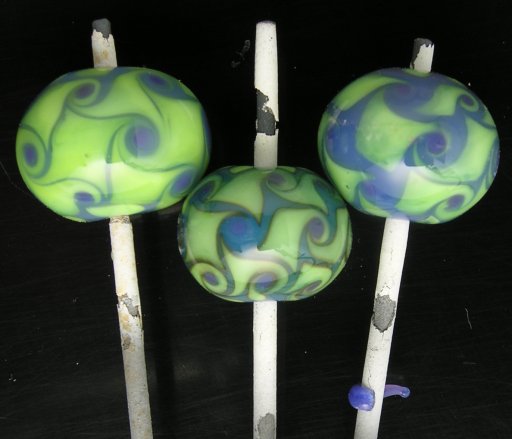 I just love Lani Ching's beads, for a variety of reasons: they have cool patterns; they're fun to make; they're a really fun variation on the dot theme; besides my considerable admiration for the artist—I had a great time at a yoga-for-beadmakers workshop she and her husband led at Gathering (Portland, I believe), besides being deeply impressed by some one who can make such wonderful beads with only 5–6 hours torch time a week. So inspiring for those of us who don't spend 12 hours a day at the torch (and find the claims of those who do being a little prone to, shall we say, a wee tad o'exaggeration...)