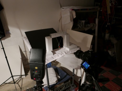 Note that studio props (boxes, styrofoam) are flat, and black plastic is tilted behind them. Foam blocks to give add'l height; also plastic is resting on 1qt yogurt container (filled with clay) for height. This sharp angle not only gives more ‘background real estate’ it looks better too.