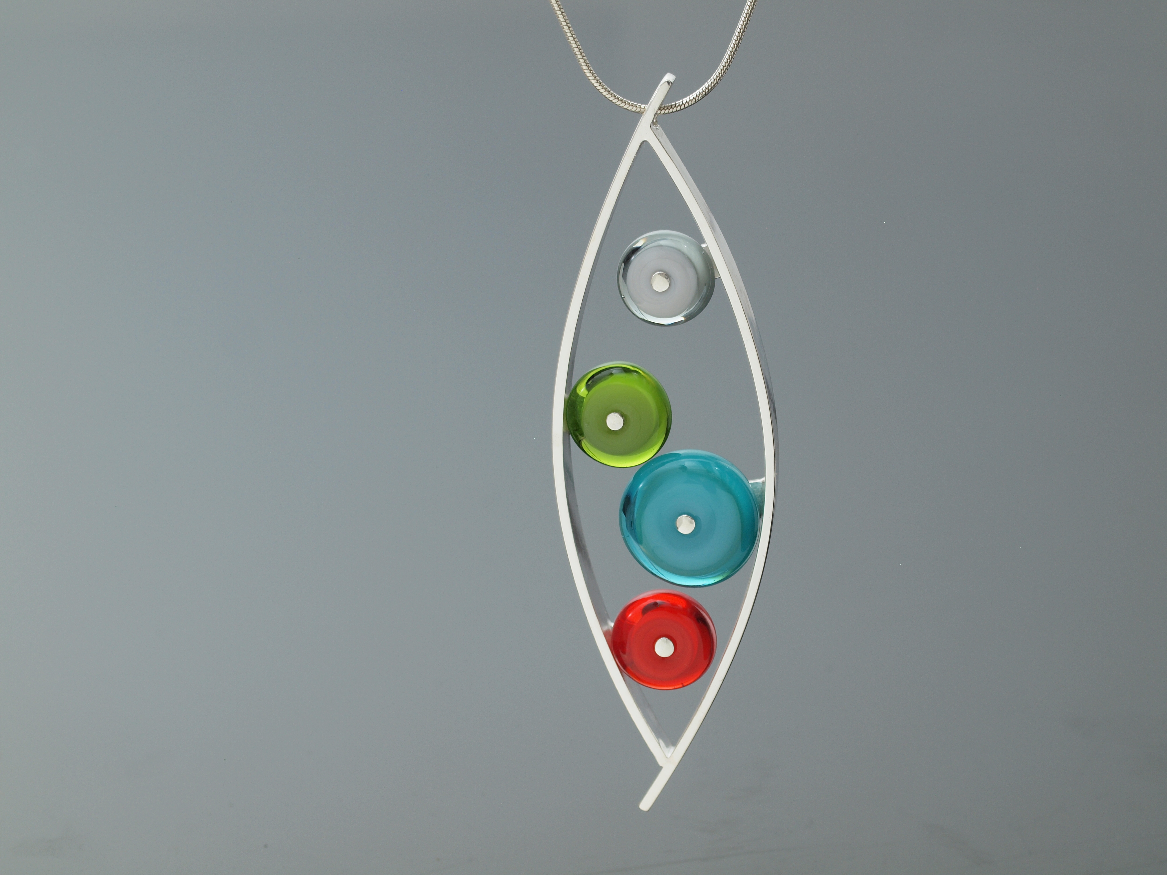Besides the excitement of having the flash images (i.e. the hanging necklaces) work pretty much right out of the gate[3] it finally dawned on me that the reason the silver is burning out[4] in the photoflood images is because the camera is reacting differentially to the highlights and midtones. See, I filter the light pretty intensely to avoid specular highlights, and also to avoid the dreaded clipping on the silver (itself a form of specular highlight). But no matter how much I diffuse the light, in order to get the rest of the piece properly exposed the shiny silver becomes overexposed—but not when I use flash.
