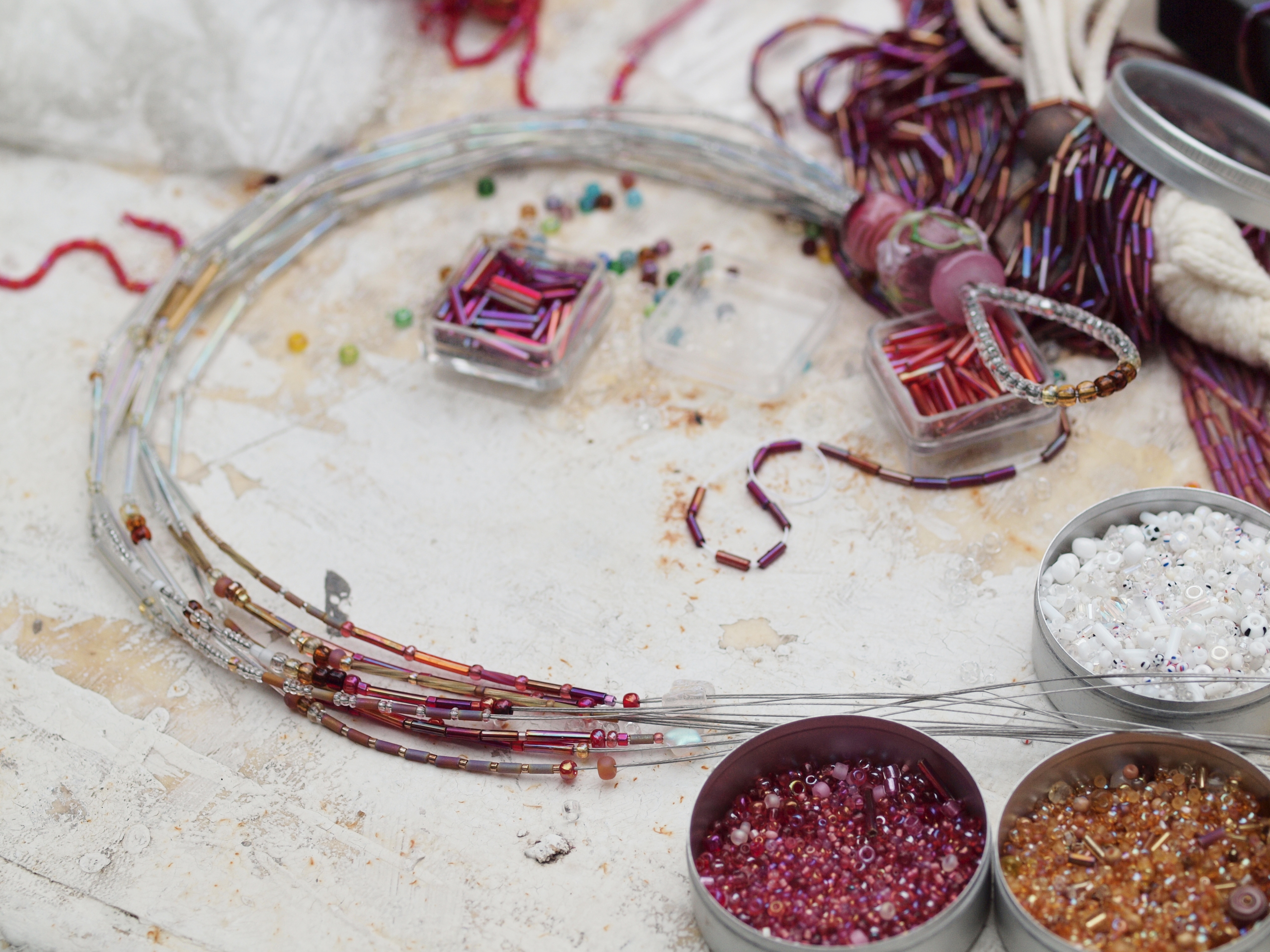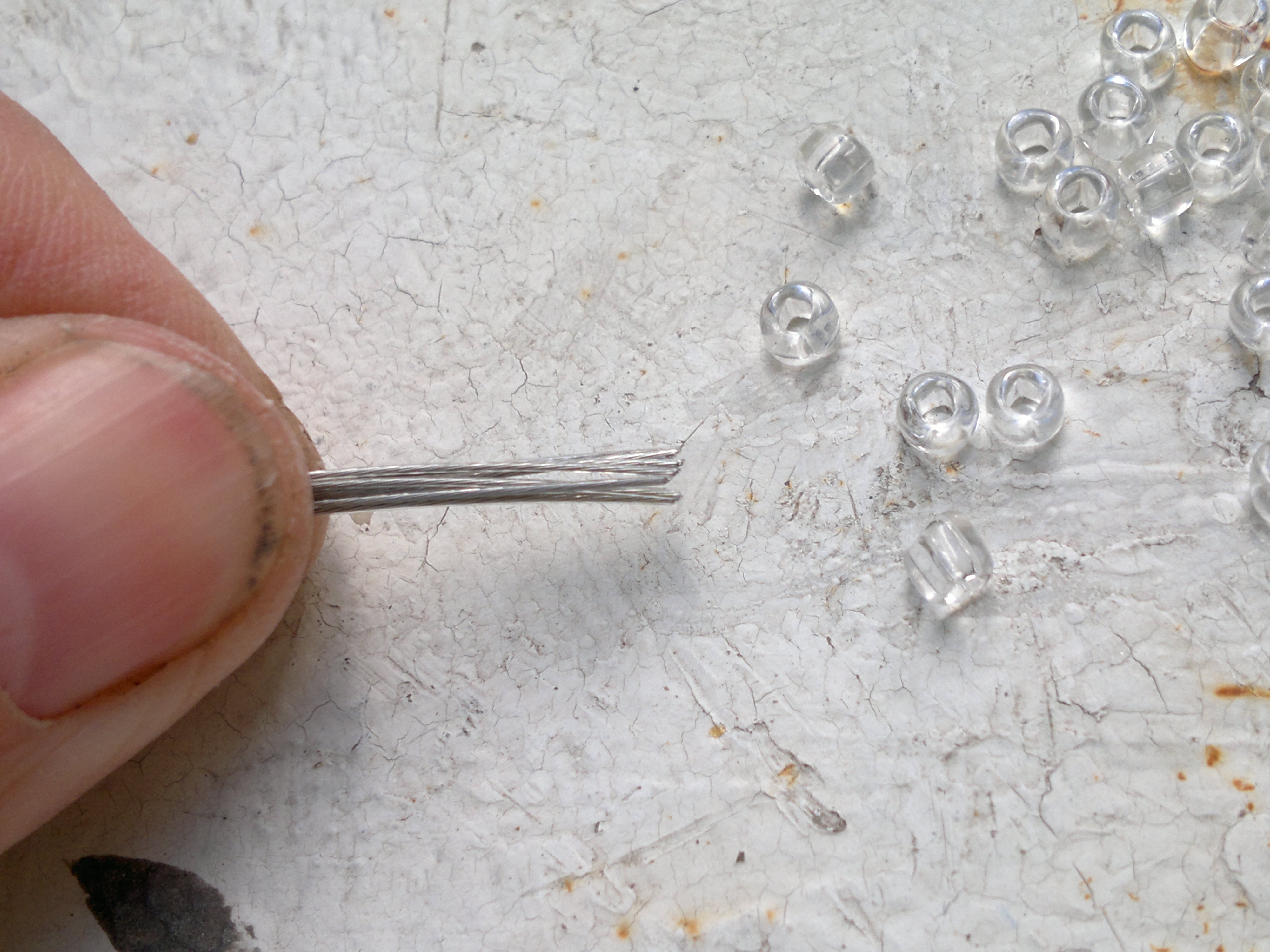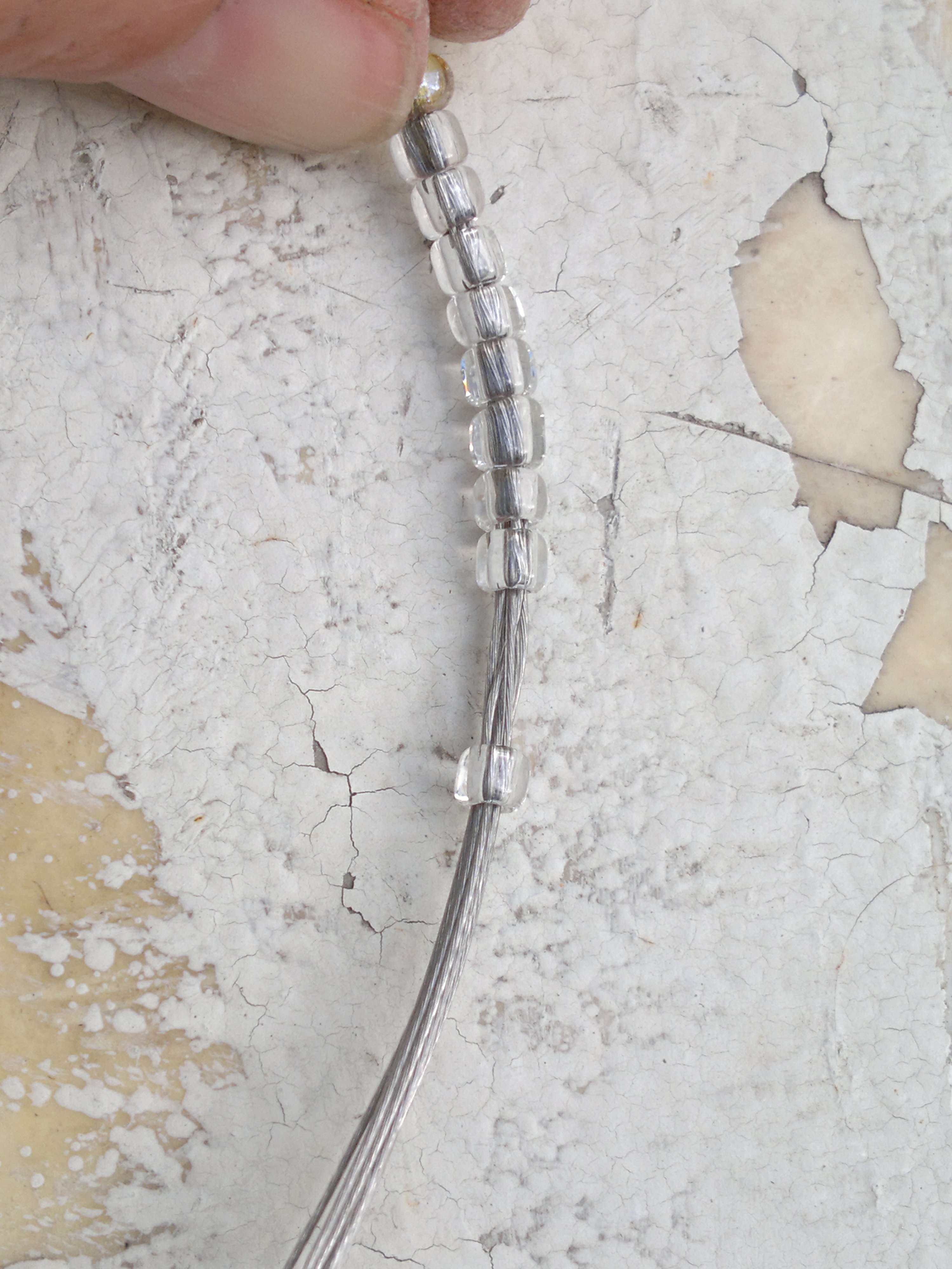 Fitting the strands through the 8/0s used to cover the top loop. By dint of using the biggest-holed 8s I could find, I managed it, though of course the tigertail twisted inside the beads.