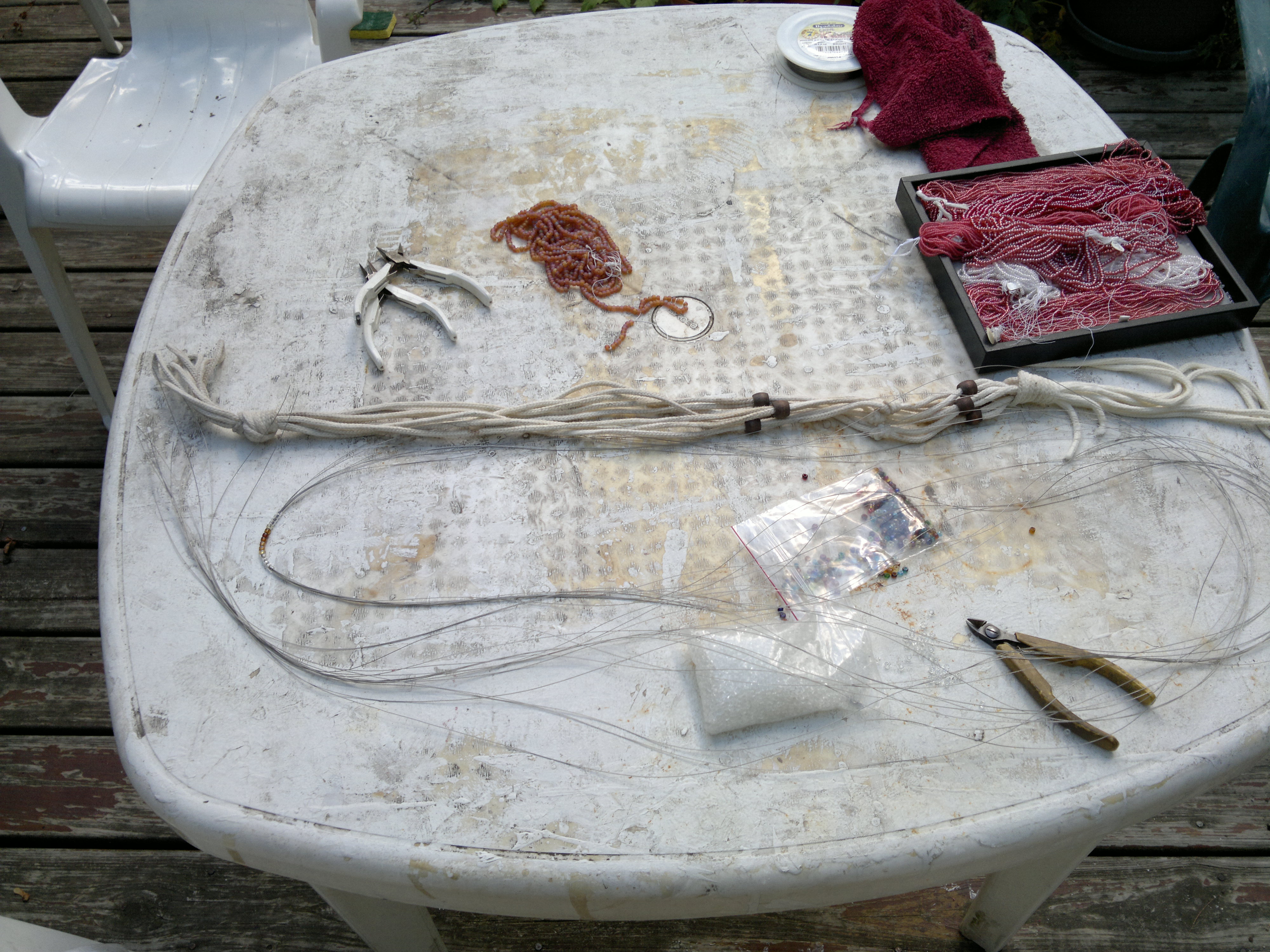 You can see this really clearly here. Moral of the story: BEFORE you start on the project, test your beads to see if the holes are large enough! Alternatively, after you discovered you've screwed up, you can pull half those extra strands out and save them for a second plant hanger.