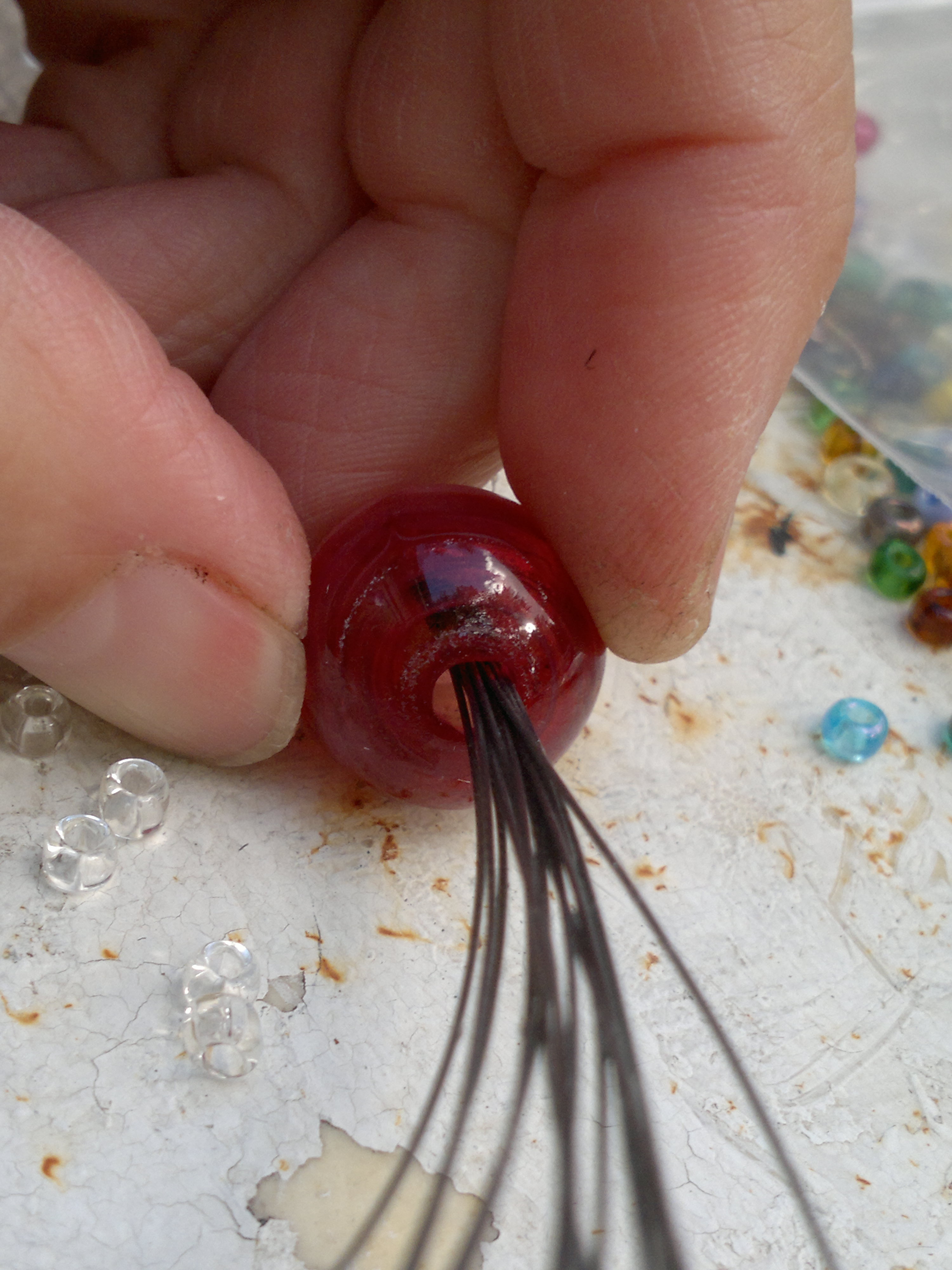 However, I became curious to see what would happen, and decided to forge on ahead. after stringing on 3–4 inches (75–100mm) worth of beads, and sliding them to the center of the tigertail (such that I had two sets of ends, 8 ea., sticking out from the middle) I folded the tigertail into a loop and ran all 16 ends thru this 12–14mm bead. Knowing that it wouldn't fit easily, I used a diamond bit to ream the hole larger, as you see above.