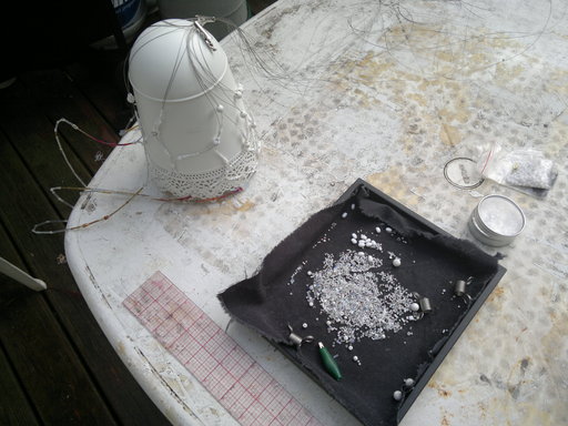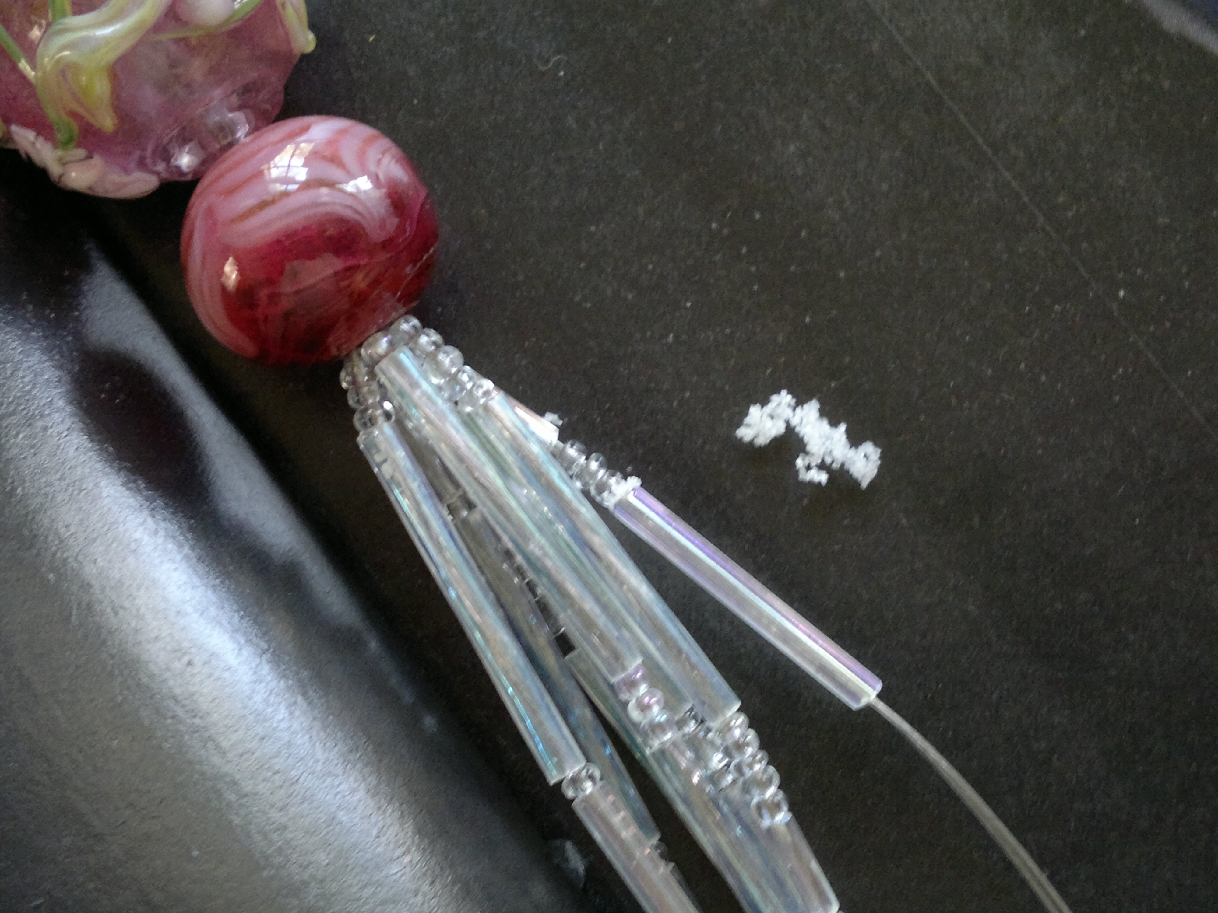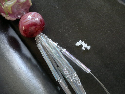 1" long bugles are just a tad on the tight side: that smutchz to the right of the bead work is plastic curls, tigertail sheathing shaved off by the holes of the beads!