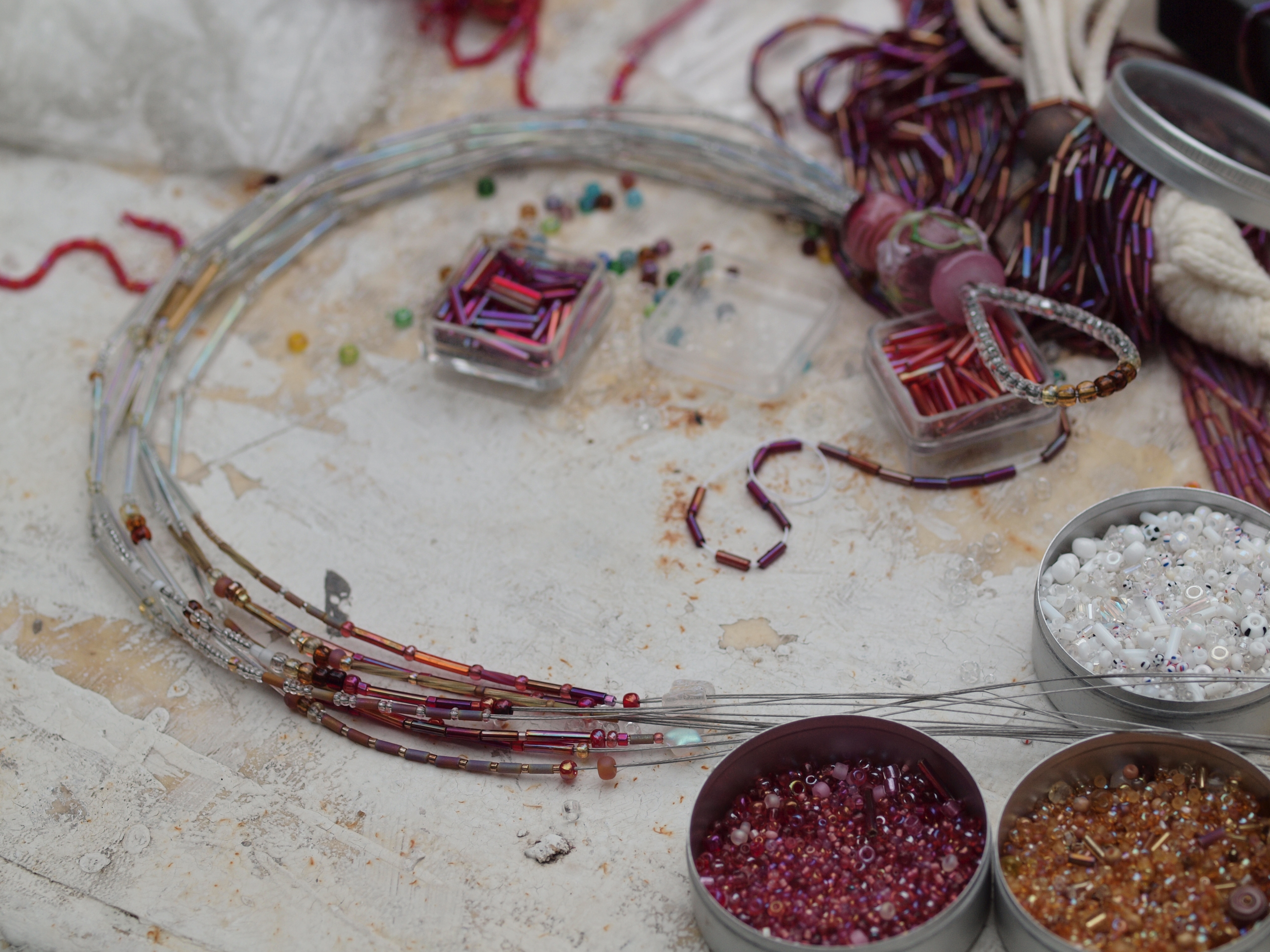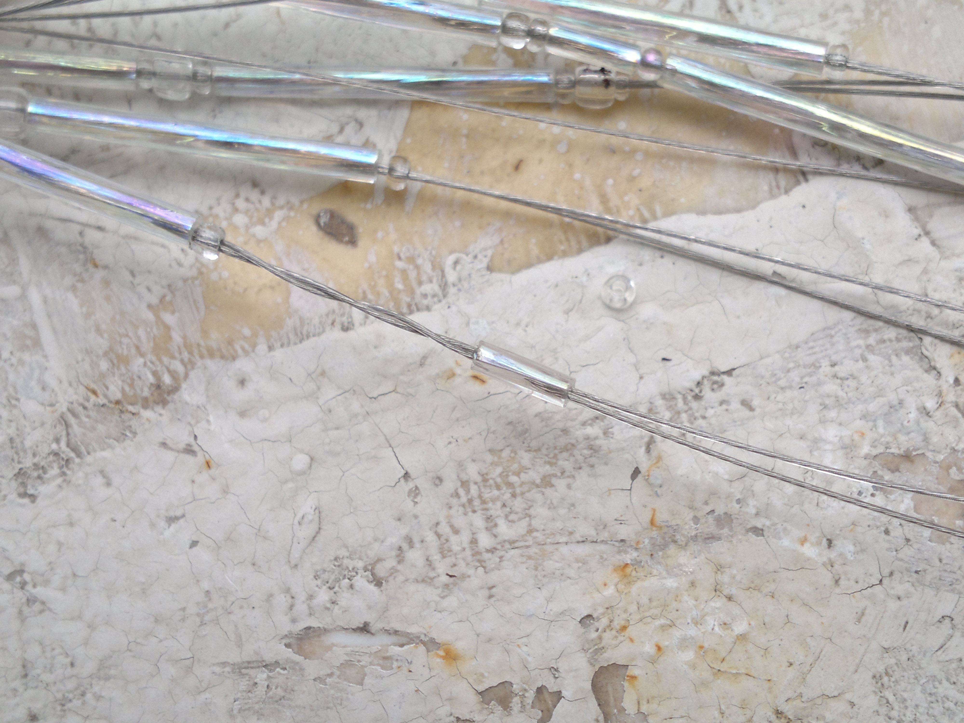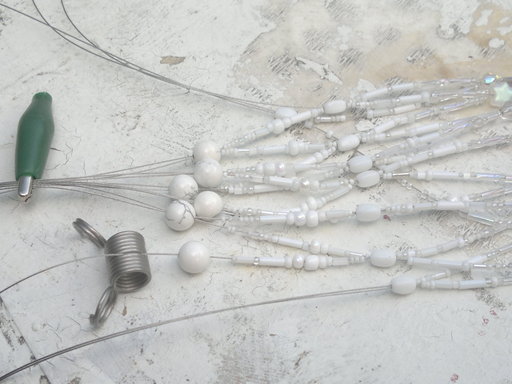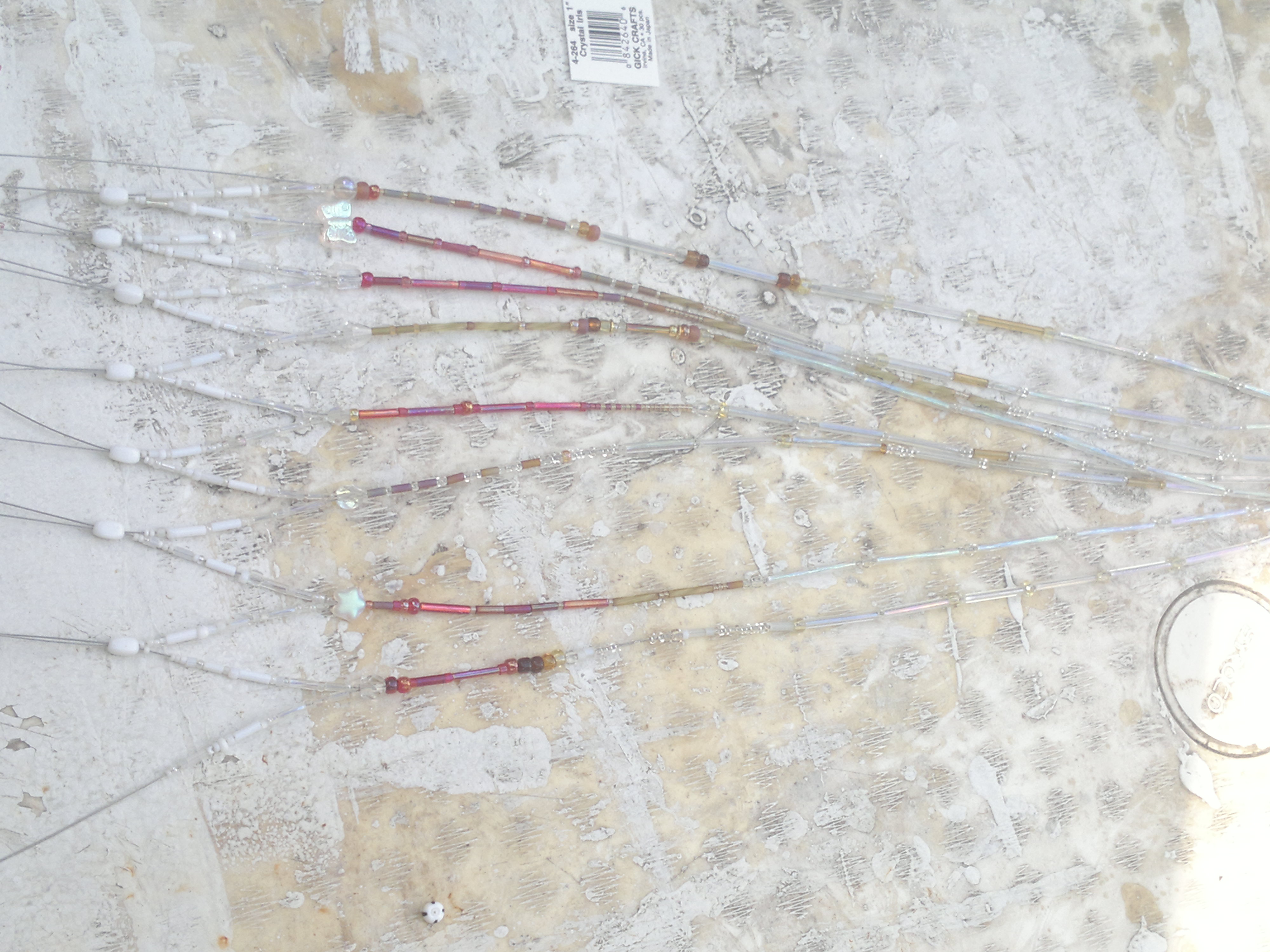 Most of ‘hanger’ part strung. This is a great project to use up those 25mm bugles that might break if they have to curve around someone's neck, because this part is held nice and straight by the weight of the plant.