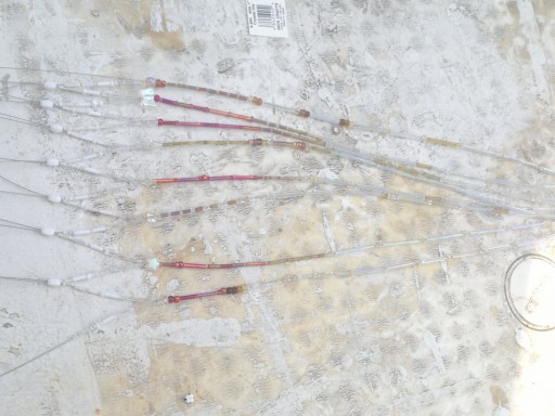This closeup illustrates the annoying habit of tigertail (7 stranded steel cable, sheathed with plastic) to twist when the bead holes are slightly too small.