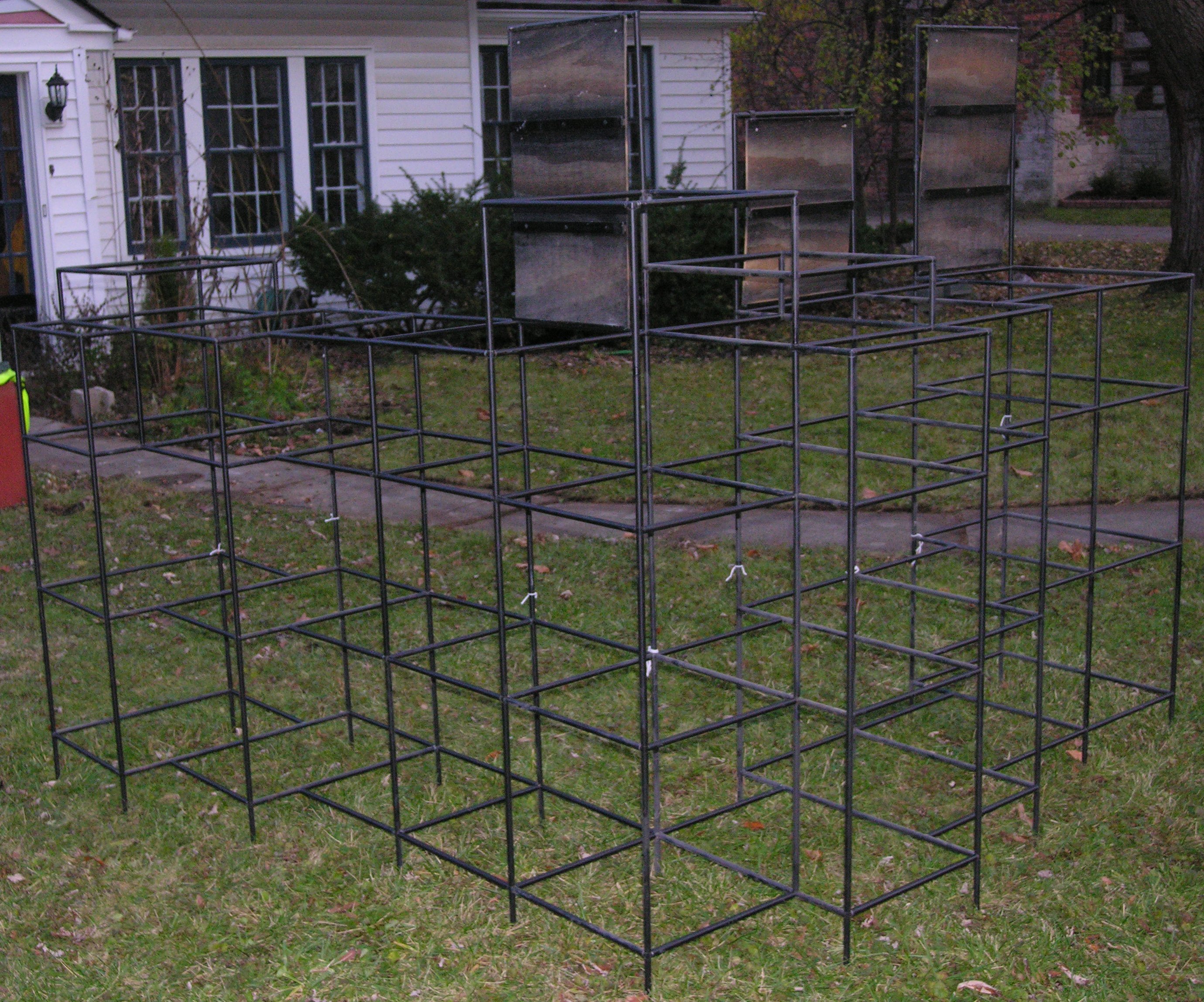 This is the framework only, without any of the fabric panels, shelves, glass or plexi inserts shown. Earring holders are mounted. Counting from the left front (or right back), poles were labeled 1, 2, 3, 4 (turn corner)...