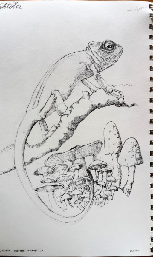 This represents a happy memory from 2016, a drawing made while drinking coffee and hanging out with art friends. Given the subject matter, I'd suspect f2tE; given the coffee, Frances. (I know we were at a coffee shop because I have a picture of coffee, with one of those fancy fern designs next to the sketchbook;) It's also possible I started the animal at home, doing the easier-while-chatting fungi while hanging out.[1]