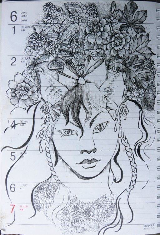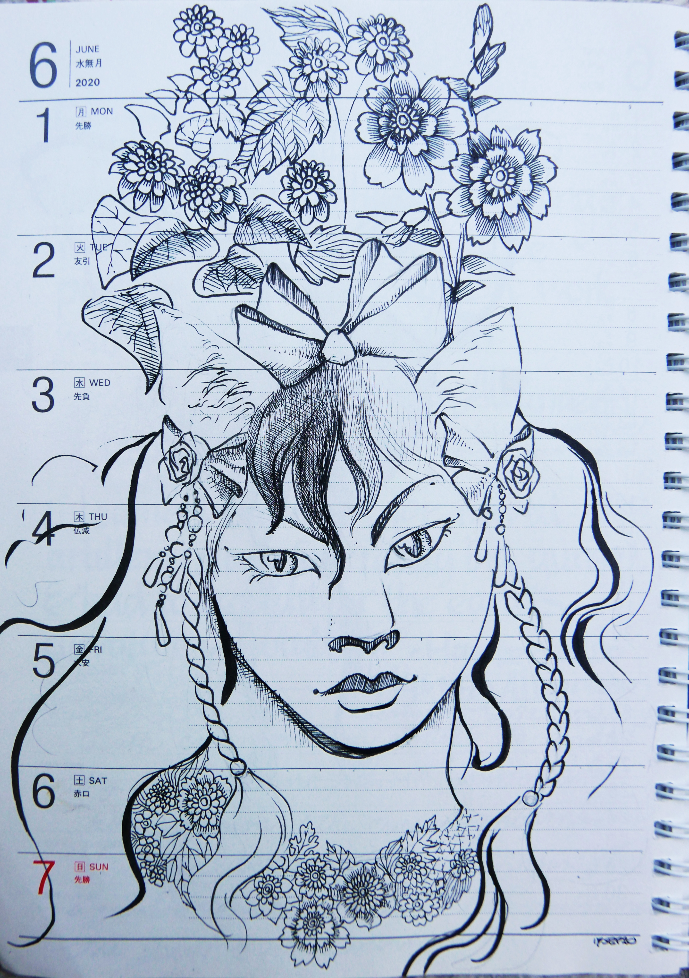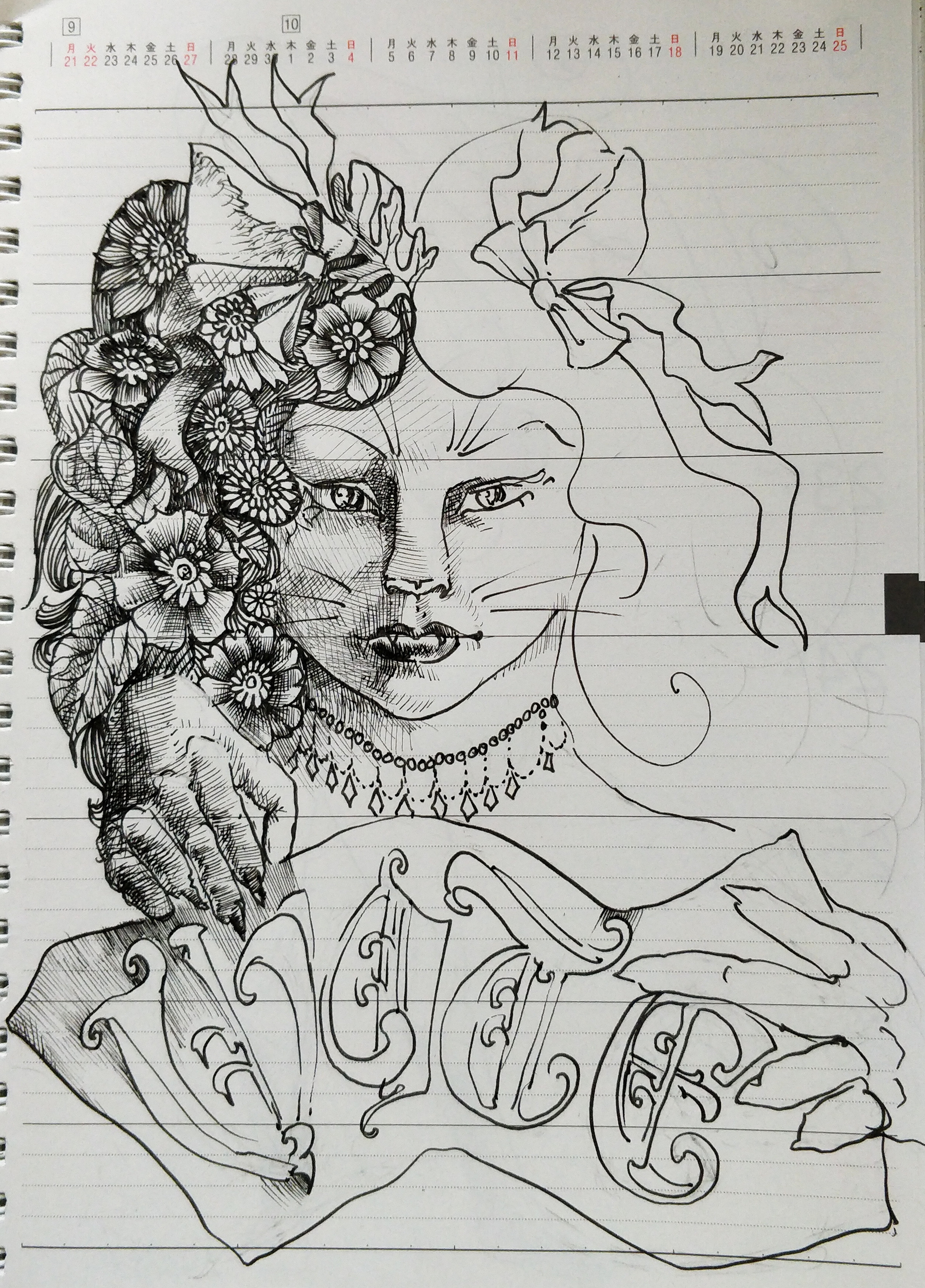 In progress. All drawings made with Microns (& graphite underdrawing) on a Japanese appointment diary page, roughly 8.25 x 5.5"; Photographed with my phone. /OnePlus/2020T/20201126T/IMG_20201022_135606adj.jpg