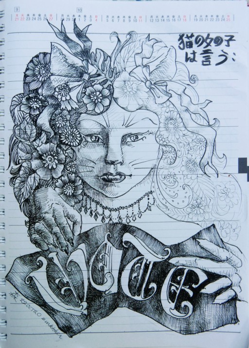 Aaaand, here's the finished art. To be perfectly honest, I think the in-progress drawing looks better; it's not so overworked, and the contrast between the cross-hatched shading on the left contrasts nicely with the outlines on the right, emphasizing Tabi's black and white hairstyle (and views.) Also, I clearly need to watch a youtube video on colour correction[1]