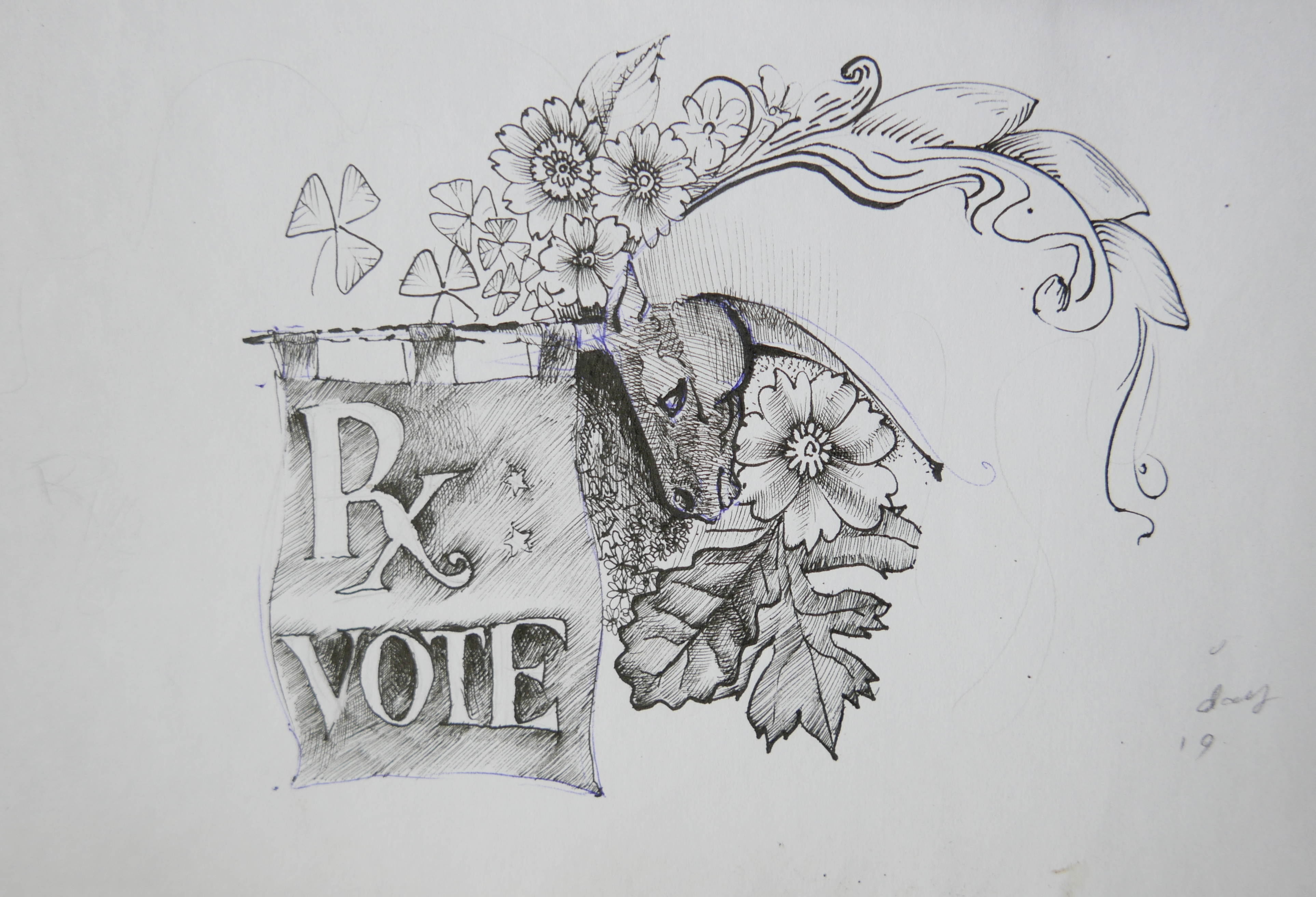 The unicorn drawing is actually third in the series (the second being yesterday's), and is the one that cemented the series. Inktober is the visual artist's answer to Nanowrimo, and to help people out with ideas, there are various sets of prompts floating out there, such the ones I did for days 1 and 2. This drawing, however, was inspired by Melanie Brooks of Earthenwood, whose work I've admired for a long time, and who is doing the the drawlloween prompts, which fit in perfectly with her current product line of creepy-horror stickers and sculptural mixed media. She chose a unicorn for the day 19 #APOTHECARY prompt, and I was (heh) promptly enchanted with the idea, which I modified by adding in the #VOTE2020 theme.