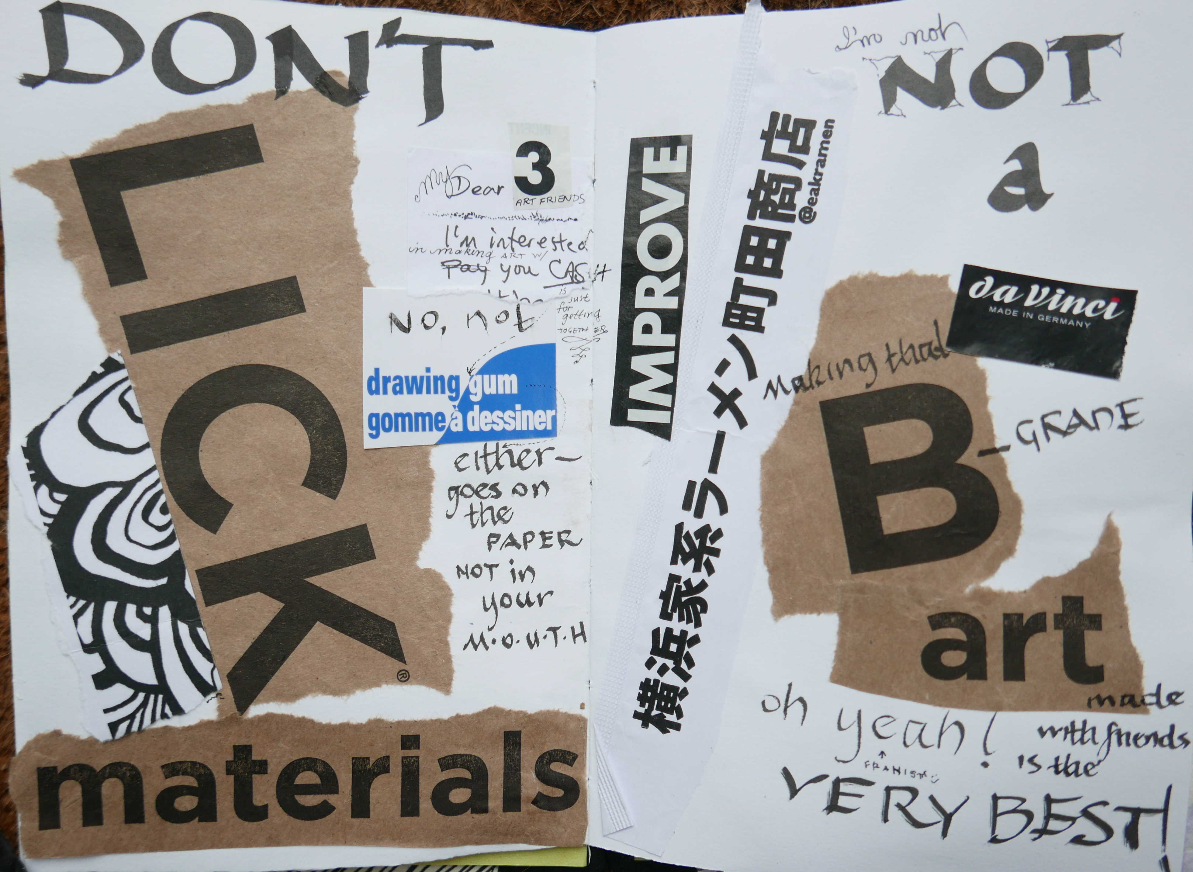 ‘Don't Lick’. Double spread, calligraphy and assemblage. Paper, ink, glue, labels. 26–27? feb 2020. Photographed 02mar20, lumix LX100, natural (cloudy) light.